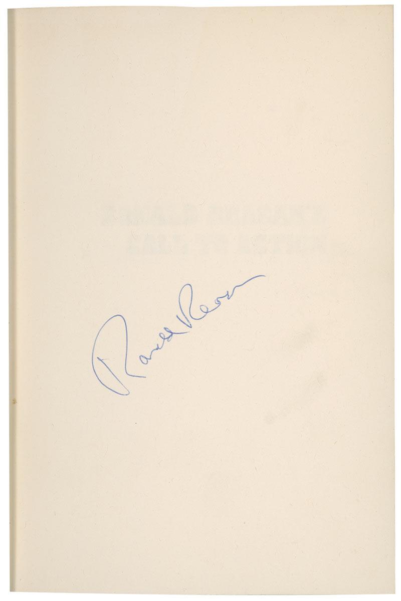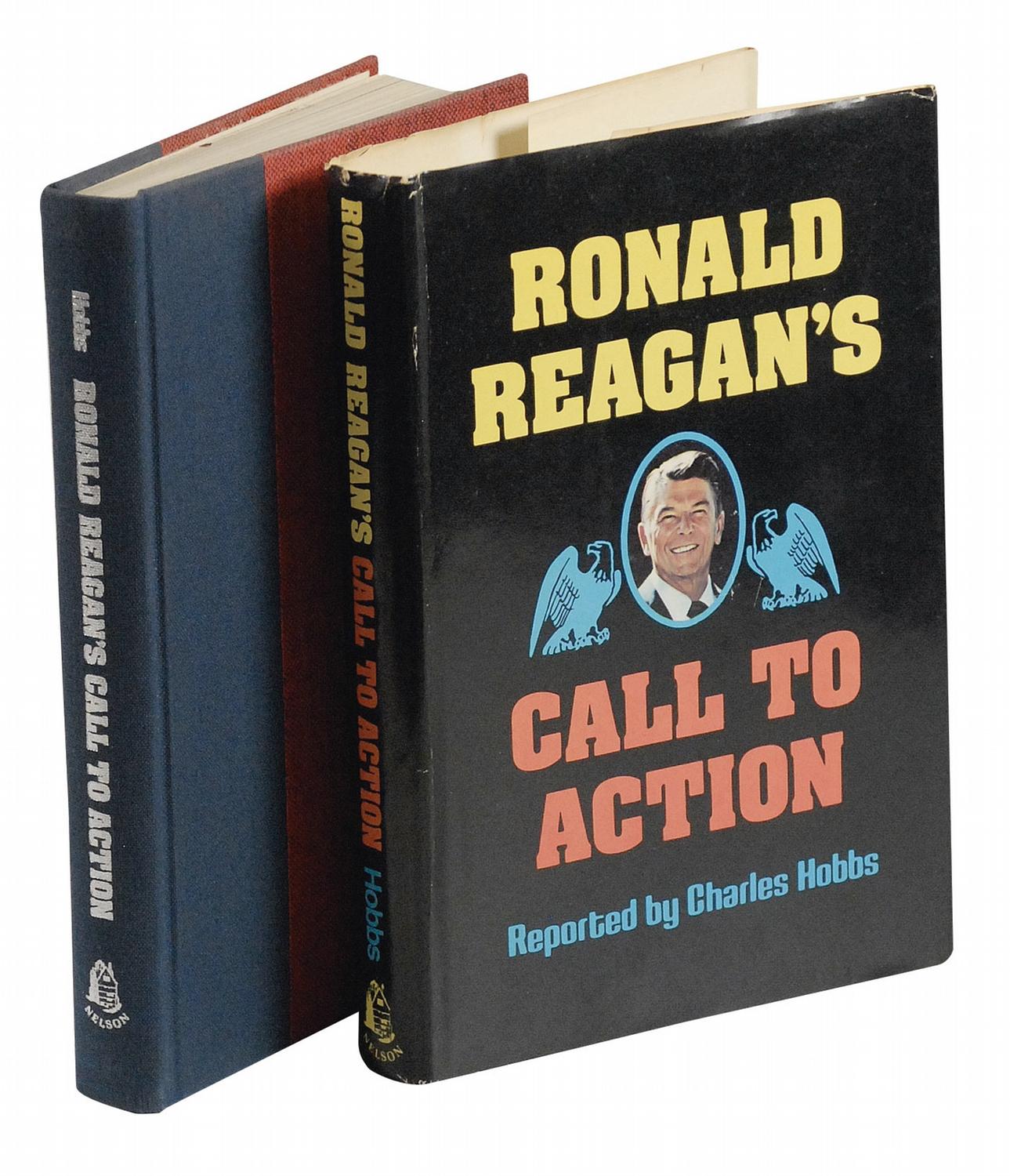 Signed book: Ronald Reagan’s Call to Action by Charles Hobbs. Later printing. NY: Thomas Nelson, Inc., 1976. Hardcover with dustjacket, 5.75 x 8.25, 190 pages. Signed in blue ballpoint on the first free end page, “Ronald Reagan.” In fine condition, with some light wear to the dustjacket.