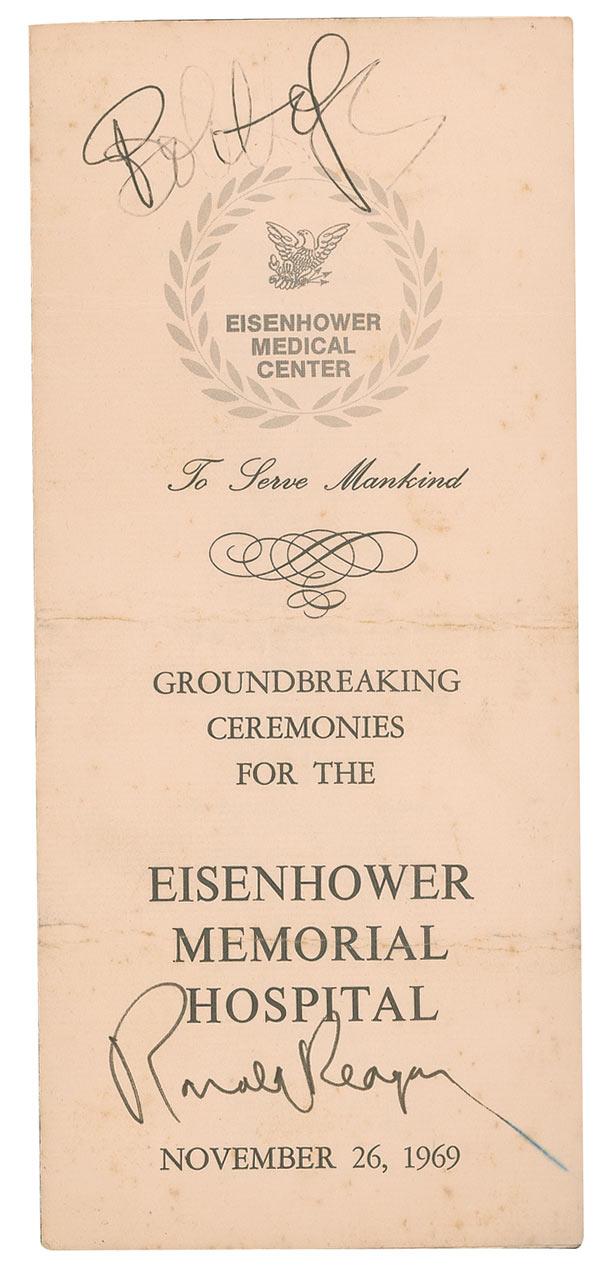 Program from the groundbreaking ceremonies for the Eisenhower Memorial Hospital held on November 26, 1969, 4 x 9, four pages, signed on the front cover in black felt tip “Ronald Reagan.” Also signed on the cover in black felt tip by Bob Hope. In very good condition, with three horizontal creases, scattered toning and soiling, the tail of the “n” in Reagan’s last name slightly discolored due to one time exposure to moisture, and much of Hope’s signature missing due to irregular ink flow.