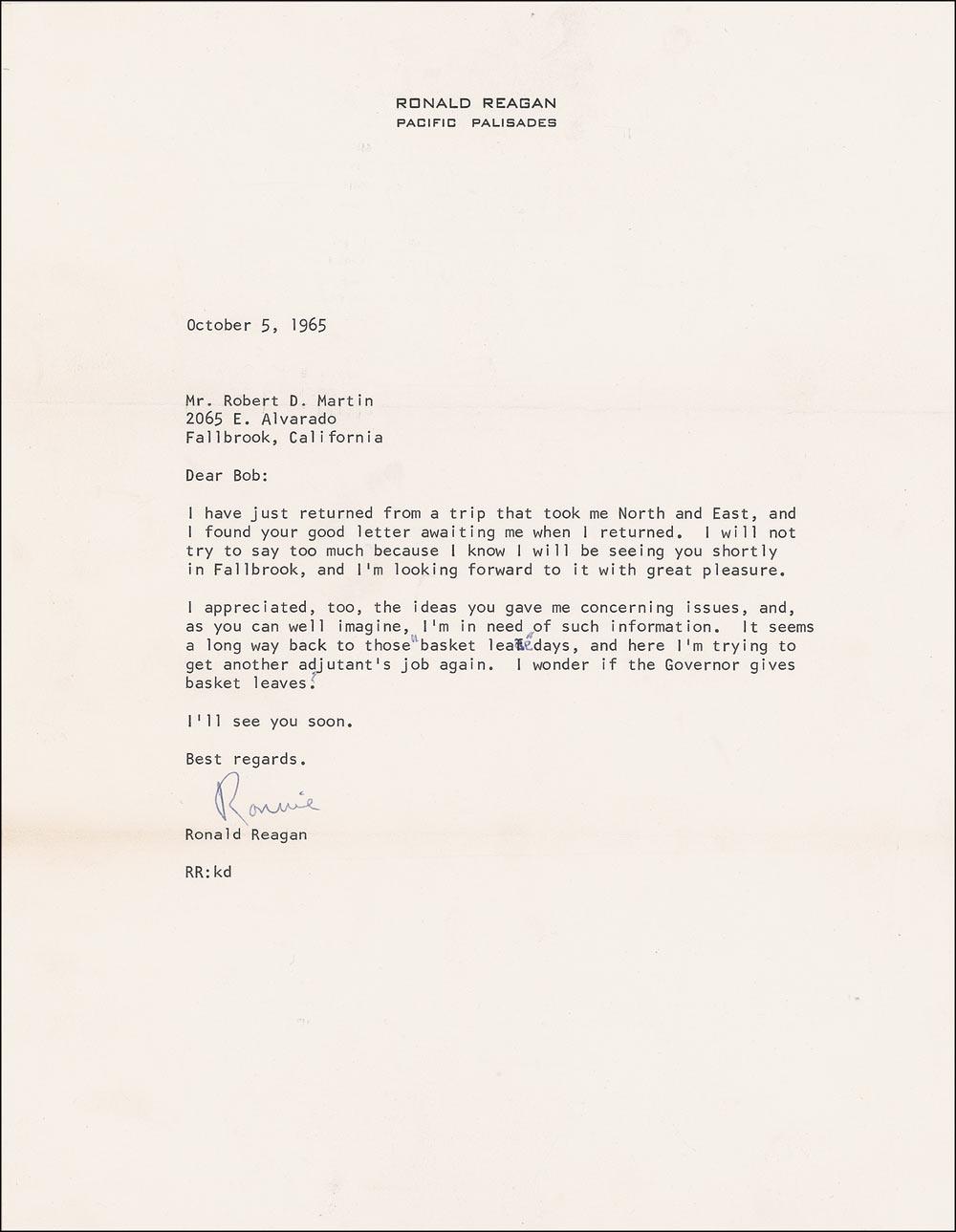 TLS signed “Ronnie,” one page, 8.5 x 11, personal letterhead, October 5, 1965. Letter to Robert Martin. In part: “I appreciated, too, the ideas you gave me concerning issues, and, as you can well imagine, I’m in need of such information. It seems a long way back to those ‘basket leave’ days, and here I am trying to get another adjutant’s job again. I wonder if the Governor gives basket leaves.” In fine condition, with some scattered light creasing and toning. A basket leave is an informal procedure whereby an officer planning to be away from his assigned post or station on a weekend or holiday is permitted to submit to his commander a signed but otherwise blank leave form. If the officer returns to his assigned post or station on time, the leave form is destroyed and the officer is not charged for leave taken. If the return of the officer is delayed, the commander fills in and approves the leave form and the officer is charged for the appropriate number of days of leave. Accompanied by the original mailing envelope.