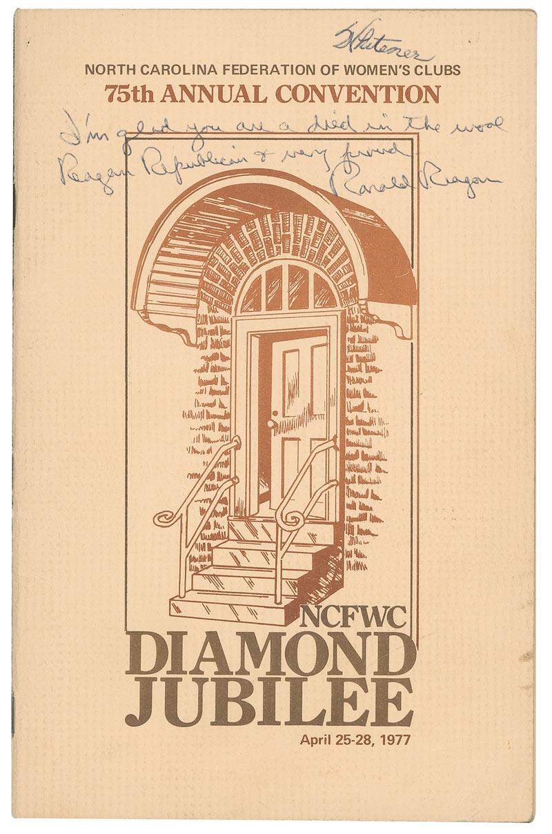 Program from the Diamond Jubilee meeting of the North Carolina Federation of Women’s Clubs held April 25-28, 1977, 5.5 x 8.5, 28 pages, signed on the front cover in blue ballpoint, “I’m glad you are a died [sic] in the wool Reagan Republican and my friend. Ronald Reagan.” A prior owner’s name is written at the top of the cover and a notation appears on the reverse. A couple of small creases and scattered soiling to the cover, otherwise fine condition.
