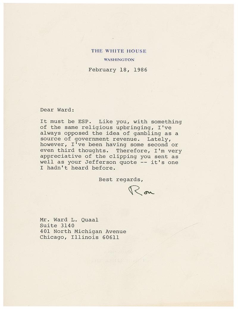 TLS as president signed “Ron,” one page, 6.75 x 9, White House letterhead, February 18, 1986. President Reagan writes Ward L. Quaal of Chicago. In full: “It must be ESP. Like you, with something of the same religious upbringing, I’ve always opposed the idea of gambling as a source of government revenue. Lately, however, I’ve been having some second or even third thoughts. Therefore, I’m very appreciative of the clipping you sent as well as your Jefferson quote—it’s one I hadn’t heard before.” In fine condition, with central horizontal fold and a tiny strip of toning at the bottom edge.