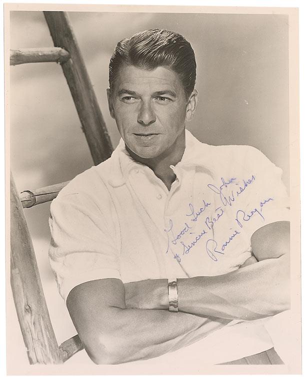 Vintage matte-finish 8 x 10 photo of Reagan leaning against a ladder, signed and inscribed in blue ballpoint “Good luck John & sincere best wishes, Ronnie Reagan.” Mild rippling from mounting remnants on reverse, and a couple slight brushes to signature and inscription, otherwise fine condition.