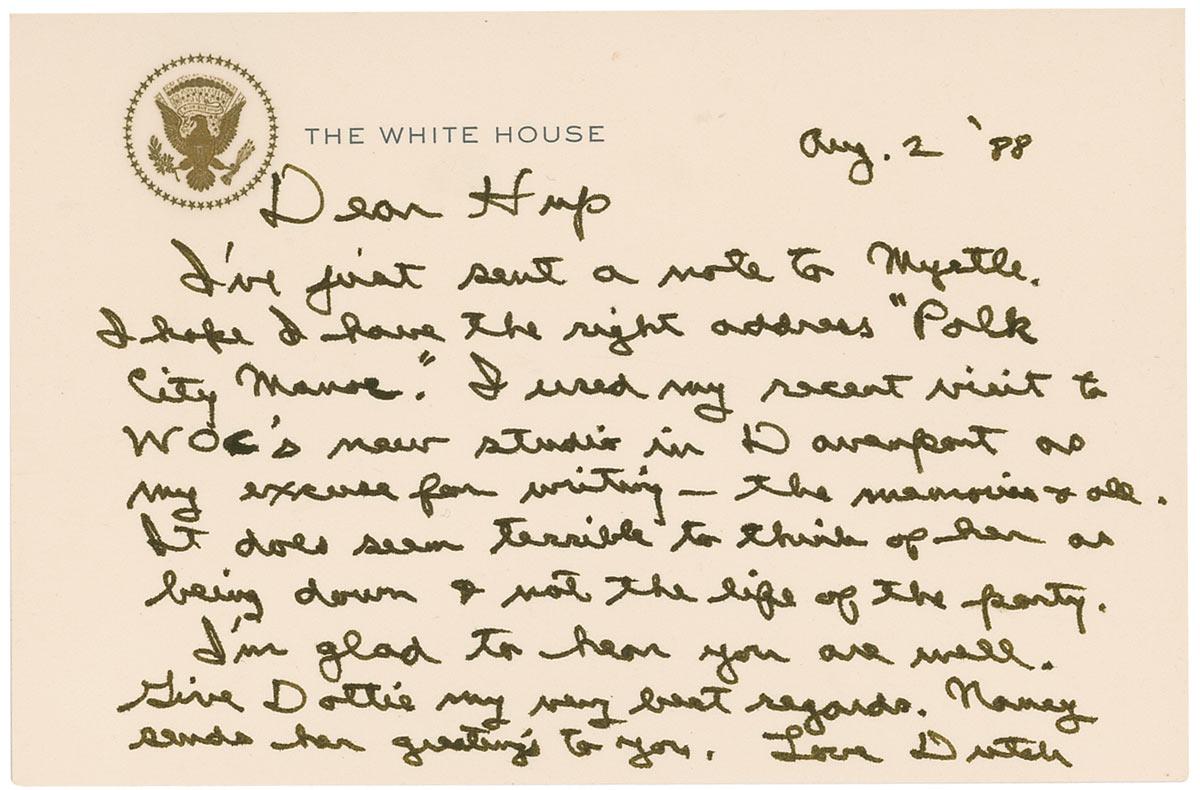 ALS as president signed “Dutch,” one page, 5.75 x 3.75, White House letterhead, August 2, 1988. Letter to his long-time friend Lydia “Hup” MacArthur. In full: “I’ve just sent a note to Myrtle. I hope I have the right address ‘Polk City Manor.’ I used my recent visit to WOC’s new studio in Davenport as my excuse for writing–the memories & all. It does seem terrible to think of her as being down & not the life of the party. I’m glad to hear you are well. Give Dottie my very best regards. Nancy sends her greetings to you.” In fine condition. Lydia Hupfer ‘Hup’ MacArthur was the widow of Pete MacArthur, program director of WOC in Davenport, Iowa. In 1932, MacArthur had given a then 21-year-old Reagan his first job as a sports announcer. They would remain friends until her passing at the age of 102 in 1995. Accompanied by the original mailing envelope addressed in Reagan’s hand.