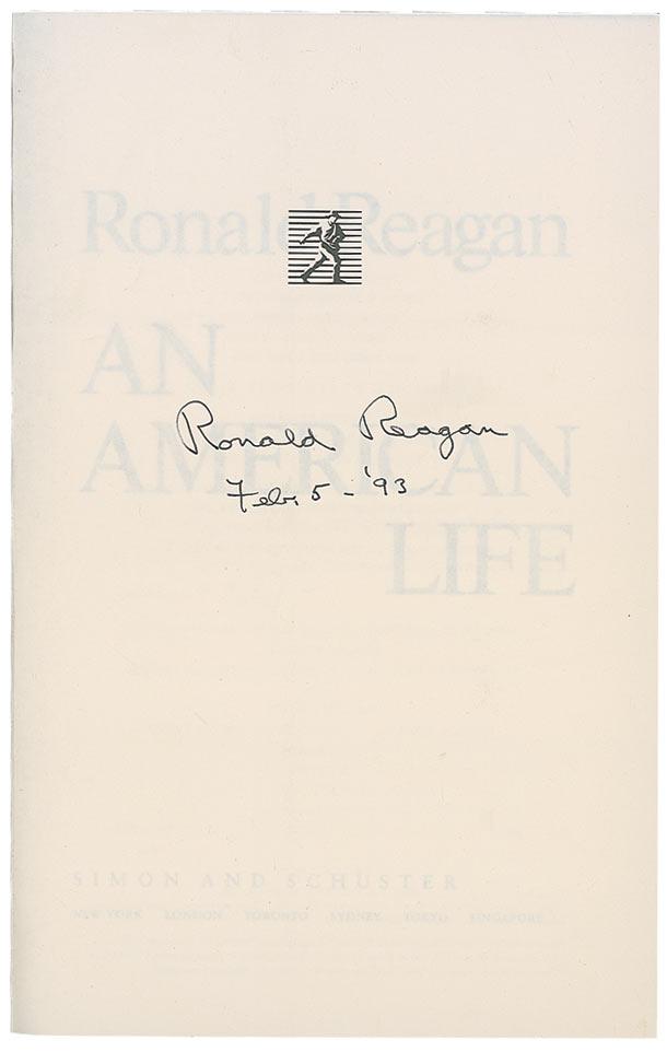Signed book: An American Life. First edition, first printing. NY: Simon & Schuster, 1990. Hardcover with dustjacket, 6.5 x 9.5, 748 pages. Signed in black ink on the second free end page, “Ronald Reagan, Feb. 5—93.” In fine condition, with some scattered wear and creasing to dustjacket.
