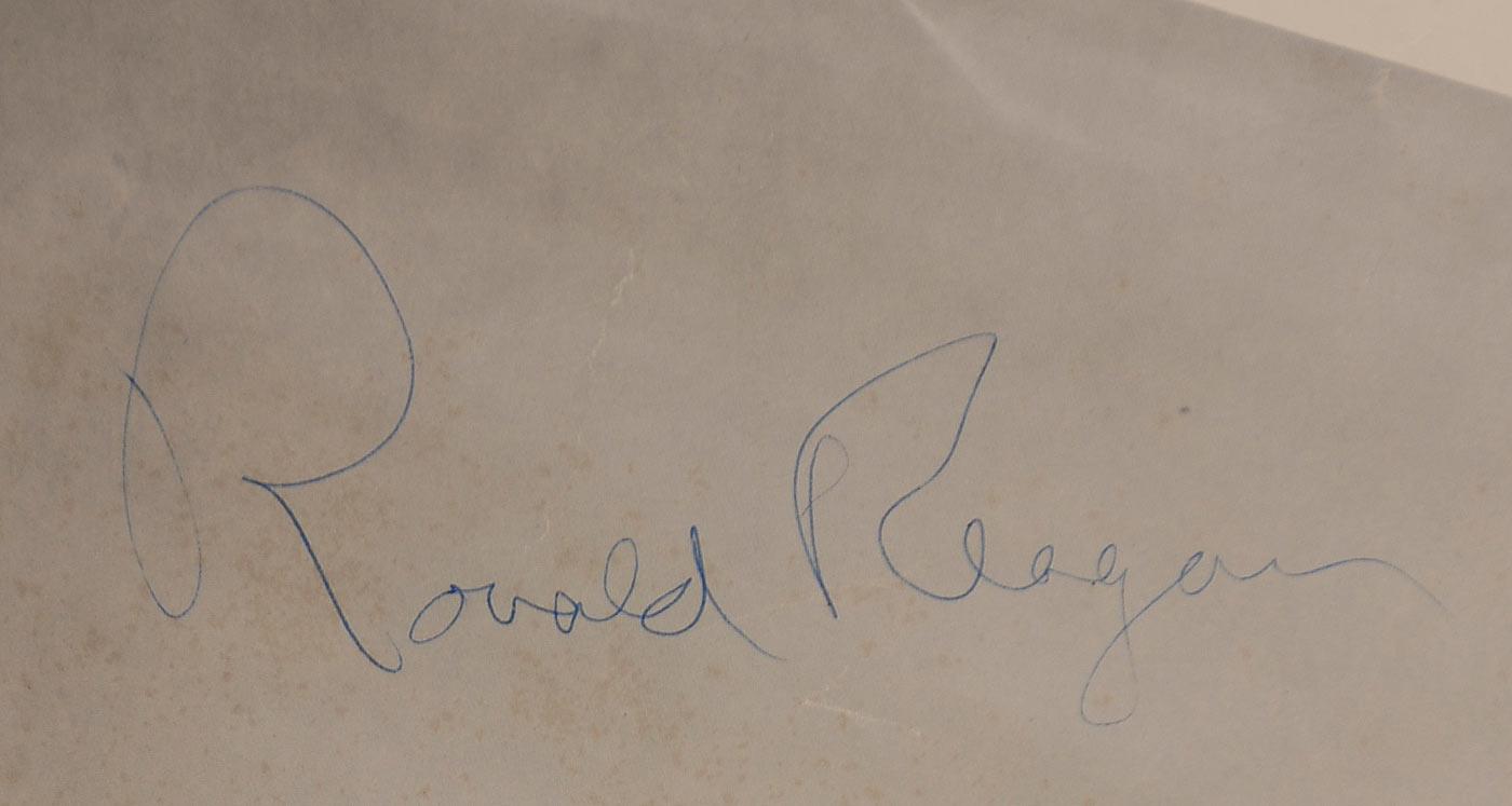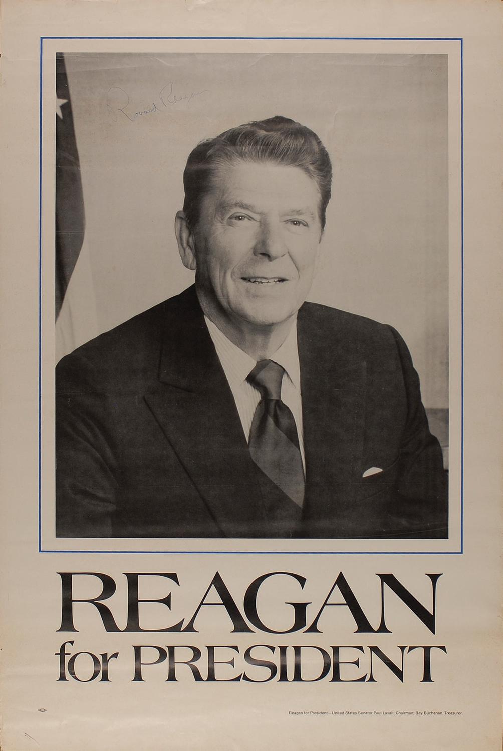 “Reagan for President” campaign poster, 24 x 36, signed in the upper left in blue ballpoint. In very good condition, with scattered toning and foxing, and scattered creasing and edge wear.