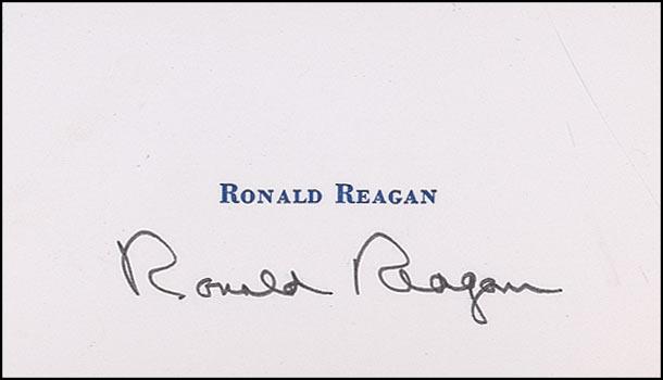 Two items: color cardstock 8 x 10 portrait signed and inscribed in black felt tip “To Charles—With Very Best Wishes & Regards—Ron”; and a white card, 3.5 x 2, with Reagan’s printed name and signed in black felt tip “Ronald Reagan.” In fine condition with some bends and small creases to the photo.