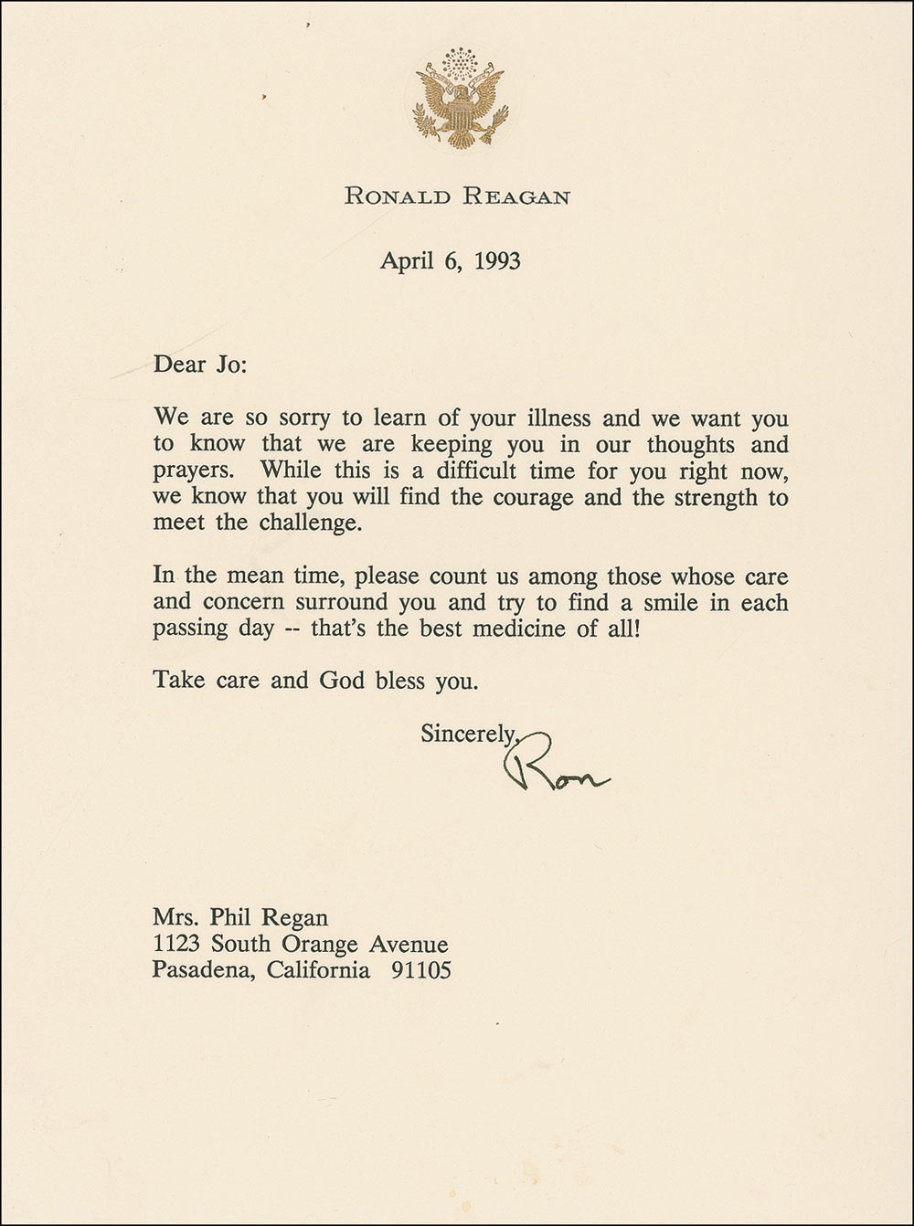 TLS signed “Ron,” one page, 6.25 x 8.5, personal letterhead, April 6, 1993. Reagan writes Josephine Regan, wife of singer, actor, and longtime Reagan supporter Phil Regan. In full: “We are so sorry to learn of your illness and we want you to know that we are keeping you in our thoughts and prayers. While this is a difficult time for you right now, we know that you will find the courage and the strength to meet the challenge. In the mean time, please count us among those whose care and concern surround you and try to find a smile in each passing day—that’s the best medicine of all!” In fine condition, with a couple of small creases and a few spots of staining.