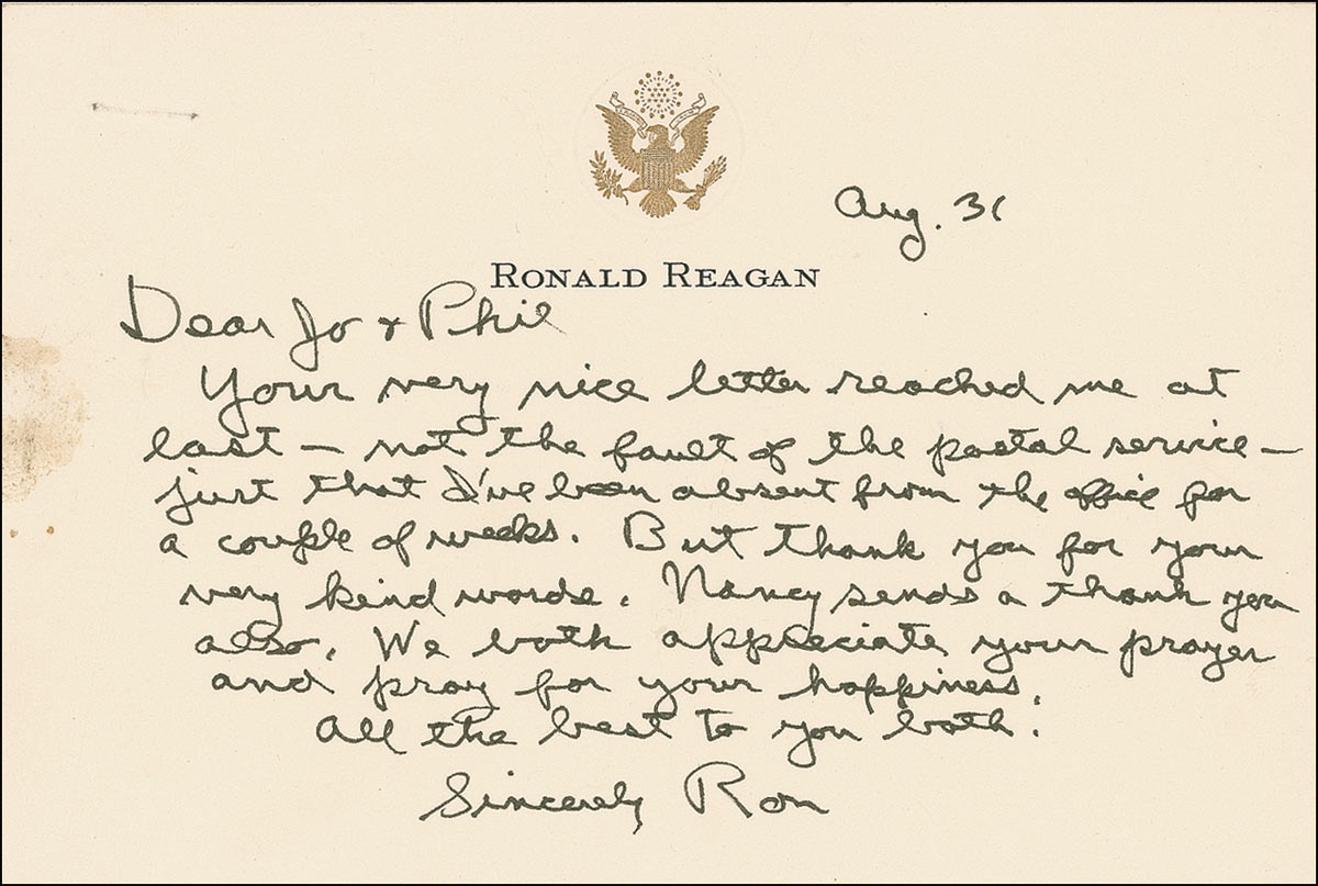 ALS signed “Ron,” one page, 6.25 x 4.25, personal letterhead, August 31. Reagan writes Phil and Jo Regan. In full: “Your very nice letter reached me at last—not the fault of the postal service—just that I’ve been absent from the office for a couple of weeks. But thank you for your very kind words. Nancy sends a thank you also. We both appreciate your prayer and pray for your happiness.” Semi-circular area of soiling along the left edge and a staple hole at the upper left corner, otherwise fine condition. Accompanied by the original mailing enveloped addressed by Reagan.