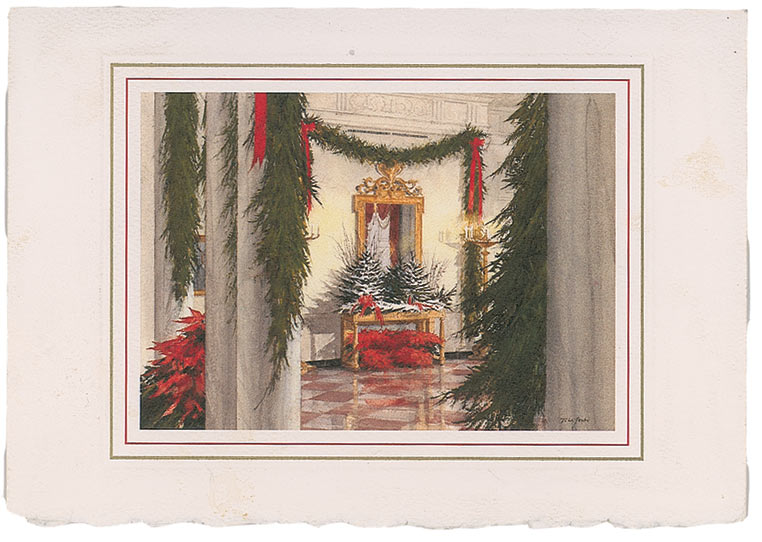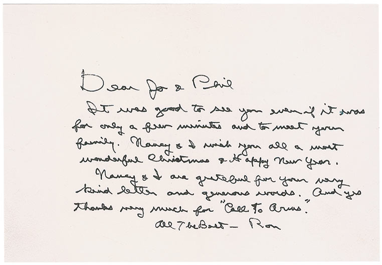 White House Christmas card, signed as president, “Ron,” measuring 7.75 x 10.75 open, dated 1988. Lower portion bears a pre-printed Christmas message from the Reagans, with Reagan writing in the upper portion, “Dear Jo & Phil, It was good to see you even if it was for only a few minutes and to meet your family. Nancy & I wish you all a most wonderful Christmas & Happy New Year. Nancy & I are grateful for your very kind letter and generous words. And yes thanks very much for ‘Call to Arms.’ All the Best.” In fine condition. Phil Regan had headed Democrats for Reagan in the 1966 California campaign for Governor. A very displayable and desirable format, written during Reagan’s final months as commander-in-chief.