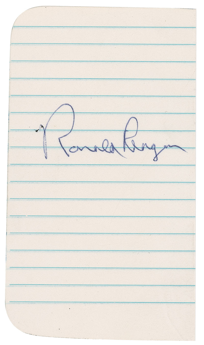 Ballpoint signature, “Ronald Reagan,” on an off-white 2.75 x 5 lightly-lined sheet. In fine condition, with faint paperclip impression at the lower right corner.