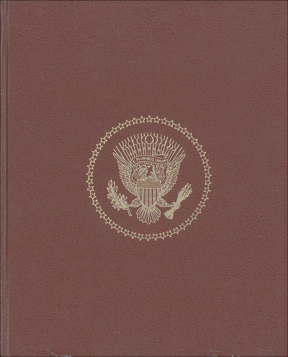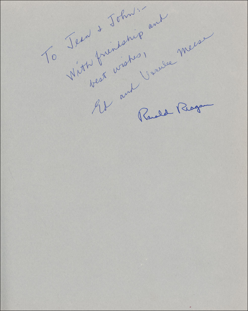 Signed book: A Great New Beginning. First edition. Presidential Inaugural Committee, 1981. Hardcover, 9.25 x 11.5, 191 pages. Signed in blue felt tip on the first free end page “Ronald Reagan.” Also signed and inscribed in blue ballpoint on the same page by Ed and Ursula Meese. In fine condition, with a few small stains and scuffs to the front cover.