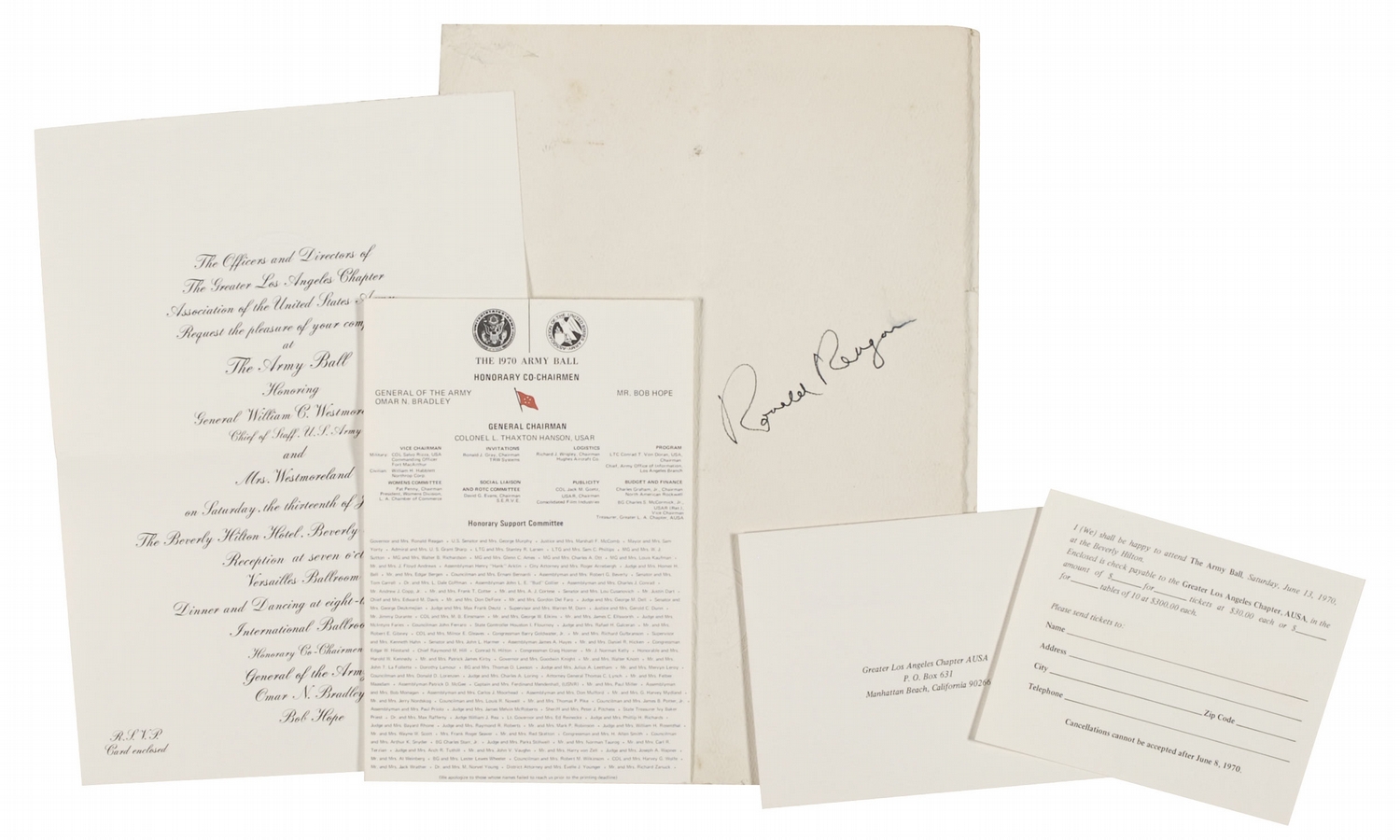 Program, 8.25 x 12, eight pages, for the 1970 Army Ball held at the Beverly Hilton Hotel on June 13, 1970, honoring General William Westmoreland, signed on the cover in black ink by Reagan. In very good condition, with a bisecting vertical fold, light toning and foxing to inside pages, water spot to end of Reagan’s signature and some light surface loss to front cover. Accompanied by an original invitation and envelope, RSVP card and envelope, and an informational card.