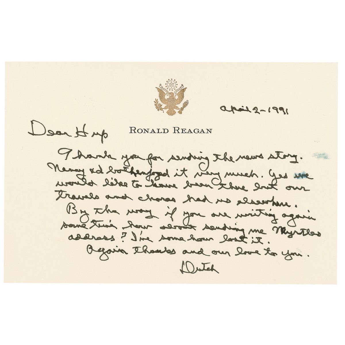 ALS signed “Dutch,” one page, 6.5 x 4.25, personal letterhead, April 2, 1991. Letter to his longtime friend Lydia ‘Hup’ MacArthur. In part: “Thank you for sending the news story. Nancy & I both enjoyed it very much. Yes we would like to have been there but our travels and chores had us elsewhere.” In fine condition, with a couple of small moisture spots to right side, affecting a single letter of text. Lydia Hupfer ‘Hup’ MacArthur was the widow of Pete MacArthur, program director of WOC in Davenport, Iowa. During the time of this letter, Reagan was being largely credited with the accomplishment of ending the Cold War, one of the notable accomplishments attributed to his second term in office.