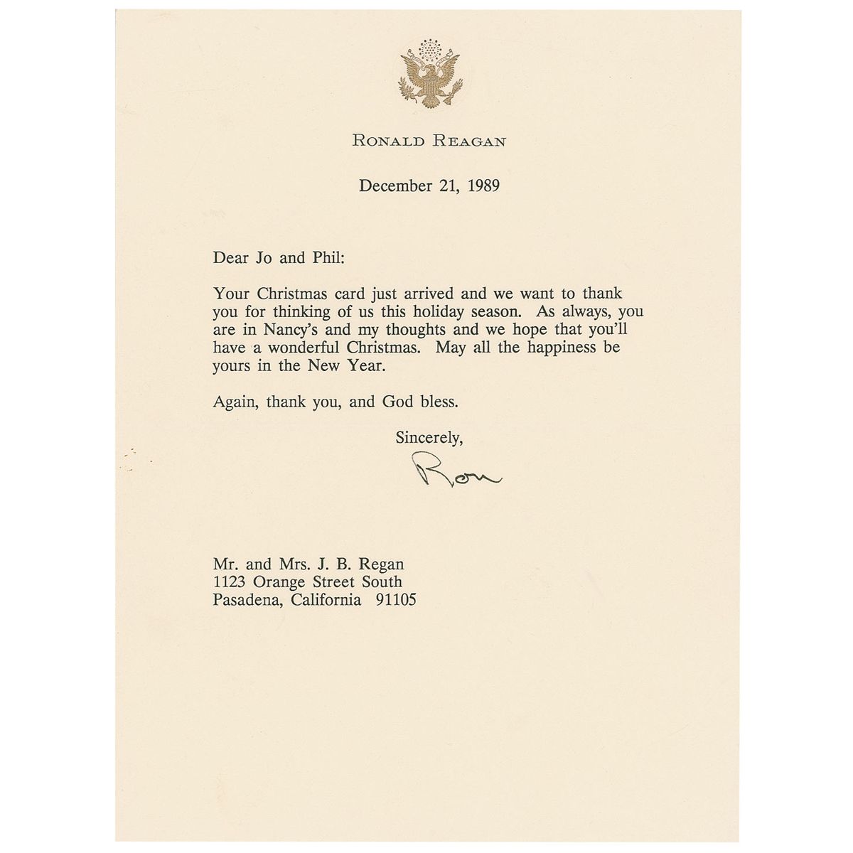 TLS signed “Ron,” one page, 6.5 x 8.5, personal letterhead, December 21, 1989. Reagan writes his old friends from Hollywood, Phil and Jo Regan. In full, “Your Christmas card just arrived and we want to thank you for thinking of us this holiday season. As always, you are in Nancy’s and my thoughts and we hope that you’ll have a wonderful Christmas. May all the happiness be yours in the New Year. Again, thank you, and God bless.” Central horizontal fold, and a few creases and wrinkles, otherwise fine condition.
