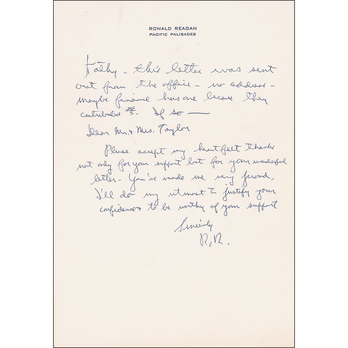 Draft ALS signed “R. R.,” one page, 7.25 x 10.5, personal Pacific Palisades letterhead, with the first part addressed to his secretary, and the second part being the draft letter. Reagan writes, in full: “Kathy—this letter was sent out from the office—no address—maybe finance has one because they contributed $5. If so—Dear Mr. & Mrs. Taylor, Please accept my heartfelt thanks not only for your support but for your wonderful letter—You’ve made me very proud. I’ll do my utmost to justify your confidence to be worthy of your support.” In fine condition, with trivial surface creasing. Accompanied by a photo of Reagan and possibly his assistant, Kathy.