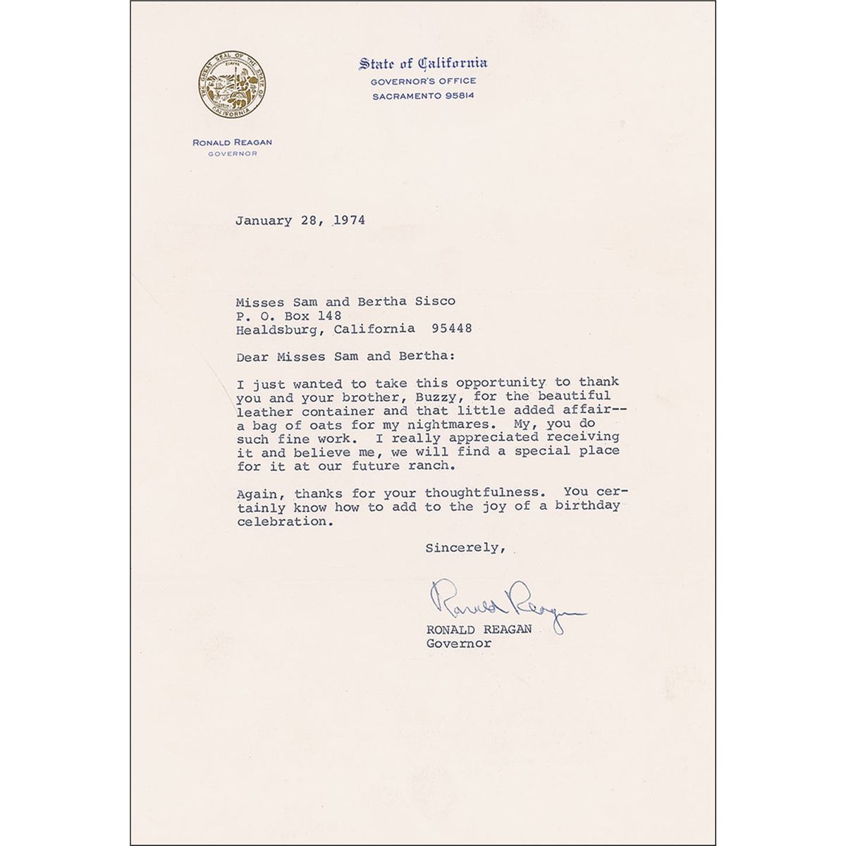 TLS, one page, 10.5 x 7.25, personal letterhead, January 28, 1974. In a letter to the Sisco sisters, with whom Reagan had continual contact from 1972 to 1987, the Governor thanks them for one of the many leather crafts they sent him, in full: “I just wanted to take this opportunity to thank you and your brother, Buzzy, for the beautiful leather container and that little added affair—a bag of oats for my nightmares. My, you do such fine work. I really appreciated receiving it and believe me, we will find a special place for it at our future ranch. Again, thanks for the thoughtfulness. You certainly know how to add to the joy of a birthday celebration.” In fine condition. Accompanied by the original mailing envelope.