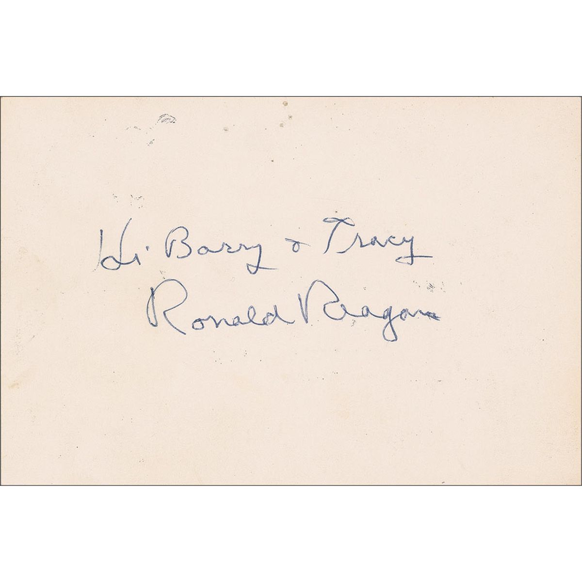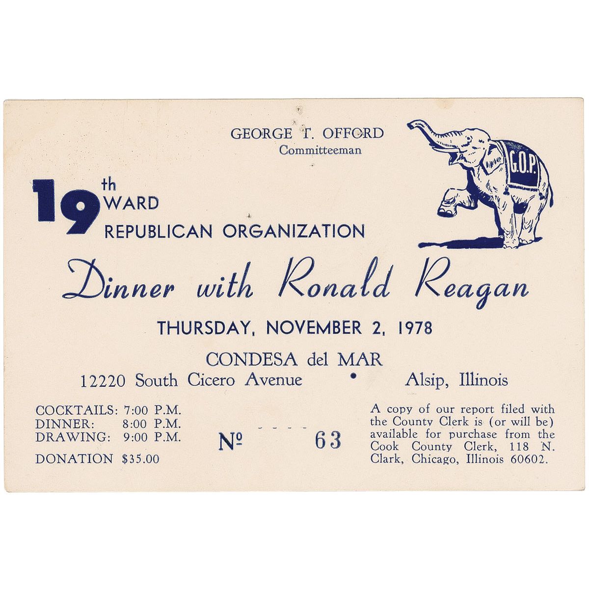 Ticket from the 19th Ward Republican Organization’s Dinner with Ronald Reagan, dated November 2, 1978, in Alsip, Illinois, 5.25 x 3.5, signed and inscribed in blue ballpoint on the reverse, “Hi Barry & Tracy, Ronald Reagan.” Light toning at the edges, a few trivial spots of soiling and stray ink marks, and a small cluster of tack holes to the center of the top edge, otherwise fine condition.