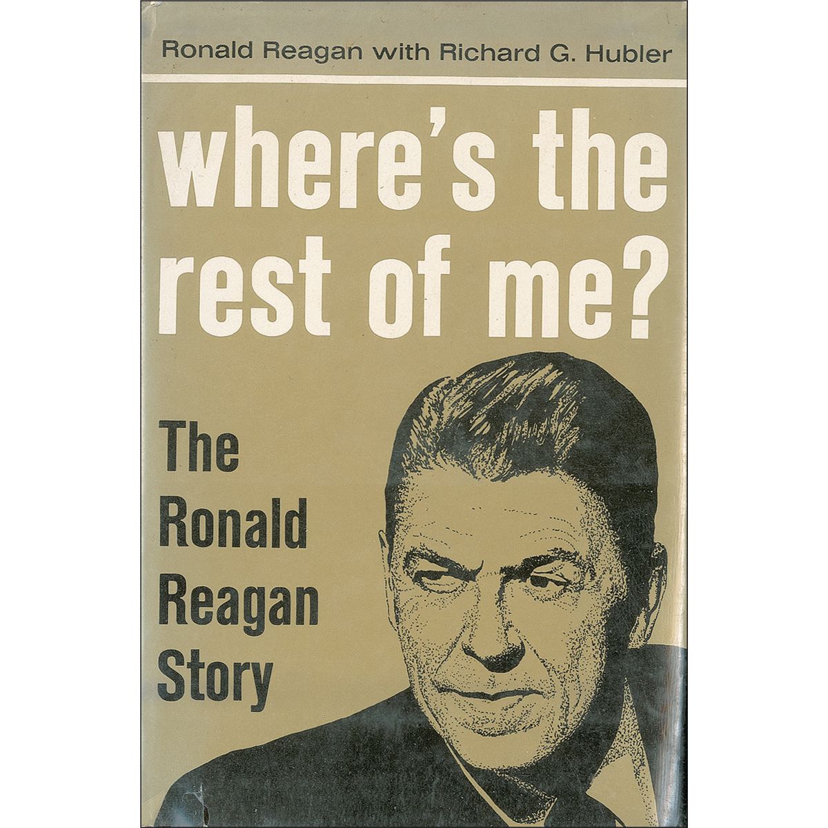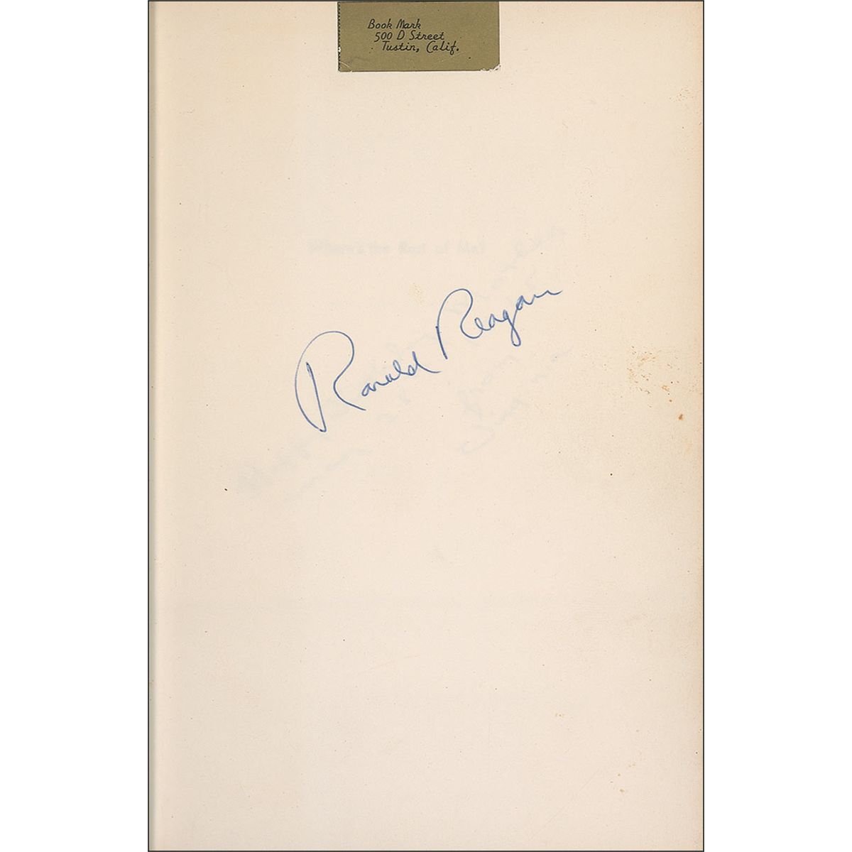 Signed book: Where’s the Rest of Me? The Ronald Reagan Story. First edition. NY: Duell, Sloan and Pearce, 1965. Hardcover with dustjacket, 5.75 x 8.25, 316 pages. Signed in blue ballpoint on the first free-end page. In very good condition, with light toning, a small area of trivial foxing. and a small sticker affixed to the signed page, none of which affect the clean and crisp signature, a presentation inscription on the half-title page, a loose, but intact, hinge, a few small tears to the dustjacket and protective cover, and a price clip to the dustjacket.