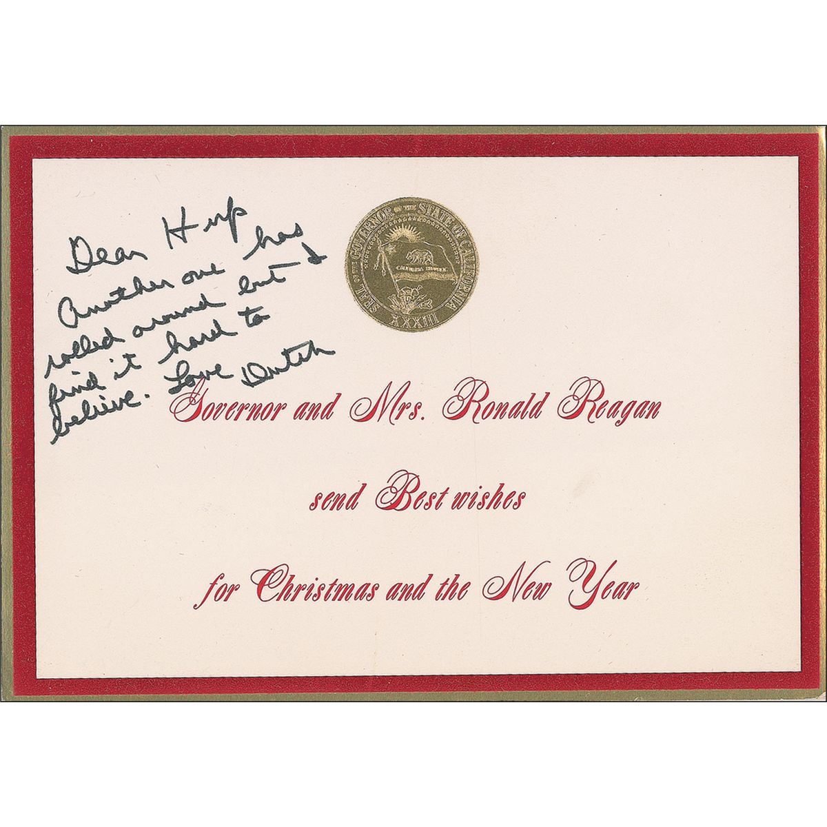 Pre-printed Christmas card sent as governor of California to his longtime friend Lydia “Hup” MacArthur, 6.25 x 4.5. Reagan pens a short note in the upper right, “Dear Hup, Another one has rolled around but I find it hard to believe. Love, Dutch.” In fine condition, with card lightly peeling up from felt mount. Lydia Hupfer “Hup” MacArthur was the widow of Pete MacArthur, program director of WOC in Davenport, Iowa. In 1932, MacArthur had given a then 21-year-old Reagan his first job as a sports announcer. They would remain friends until her passing at the age of 102 in 1995. In fine condition, with card lightly peeling away from its backing, and a bit of trivial soiling.