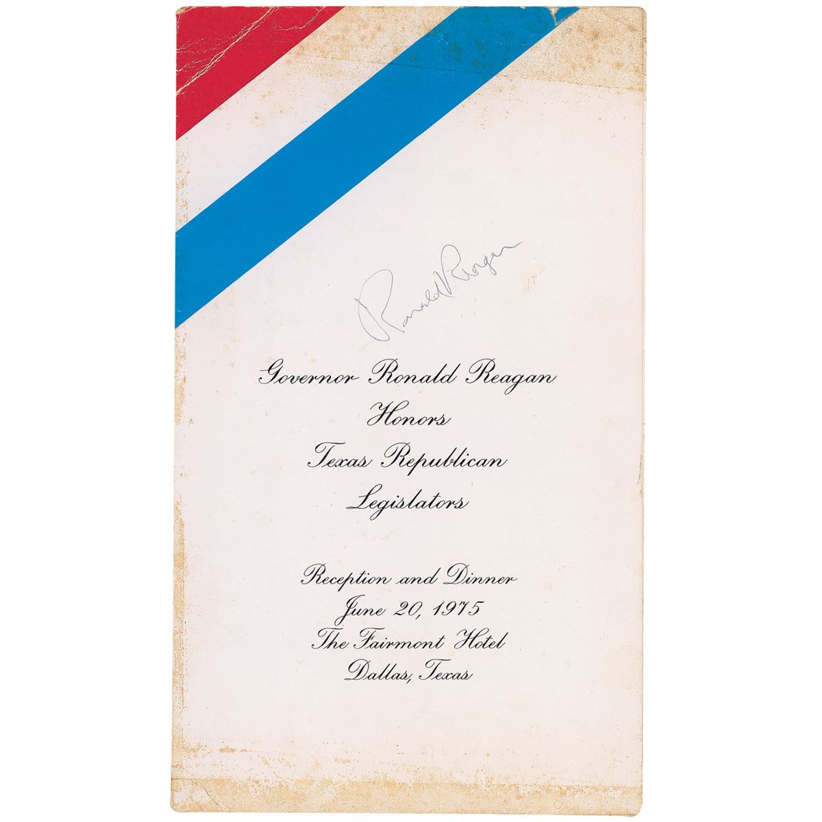 Program, 7.5 x 13, three pages, for the Governor Ronald Reagan Honors Texas Republican Legislators Reception and Dinner, June 20, 1975 at The Fairmont Hotel, Dallas, Texas, signed in ballpoint on the front cover, “Ronald Reagan.” In very good condition, with corner creasing, surface marks, and moderate toning and foxing along the folds and edges.