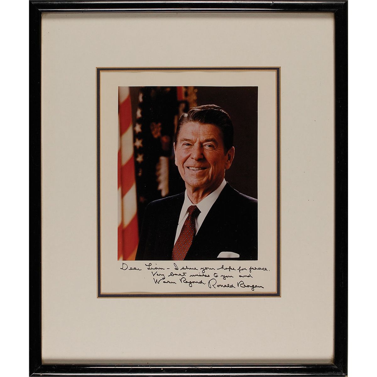Color satin-finish 7.5 x 9.5 head-and-shoulders photo, signed and inscribed in the lower border in black felt tip “Dear Liam—I share your hope for peace. Very best wishes to you and Warm Regards. Ronald Reagan.” Double matted and framed to an overall size of 13.75 x 16.25. In fine condition, with some mild rippling along top edge.