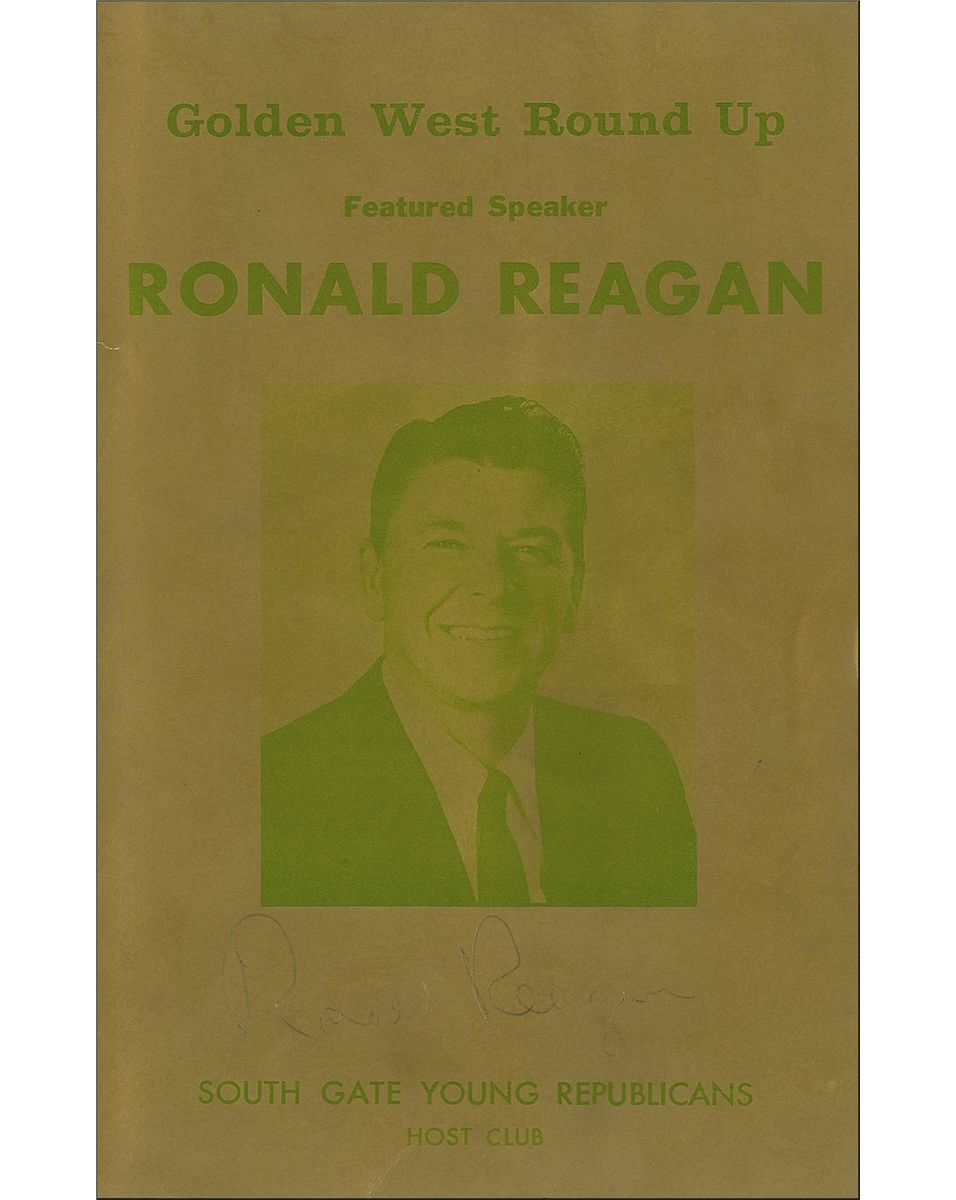 Program from the Golden West Round Up, hosted by the South Gate Young Republicans on May 24, 1966, 5.5 x 8.5, signed on the front cover in blue ballpoint. Light creasing and handling wear, a couple light fingerprints over signature, as well as some light skipping to signature, otherwise fine condition.