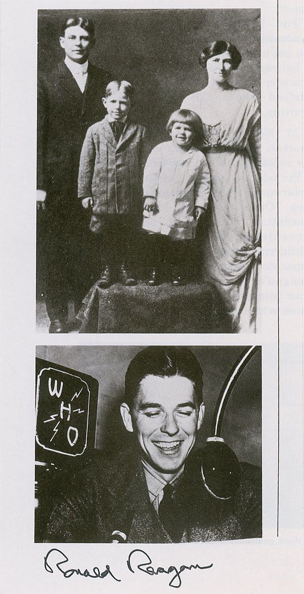 Composite 3.5 x 7 book photo showing a young Reagan with his parents and an image of Reagan behind a WHO microphone, signed in the lower border in black felt tip. In fine condition.
