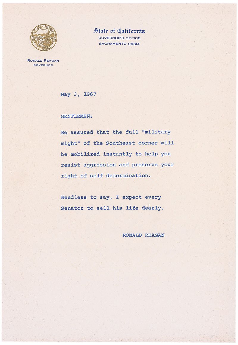 Draft ALS signed “RR,” one page, 7.25 x 10.5, State of California letterhead, May 3, 1967. Draft letter reads, in full: “Be assured that the full ‘military might’ of the Southeast corner will be mobilized instantly to help you resist aggression and preserve your right of self determination. Needless to say, I expect every Senator to sell his life dearly.” In fine condition. On May 15, 1969, Reagan sent the California Highway Patrol to quell protests at UC Berkeley in an incident that came to be known as ‘Bloody Thursday.’ He then had 2200 National Guard troops occupy the city of Berkeley for an additional two weeks to maintain order.