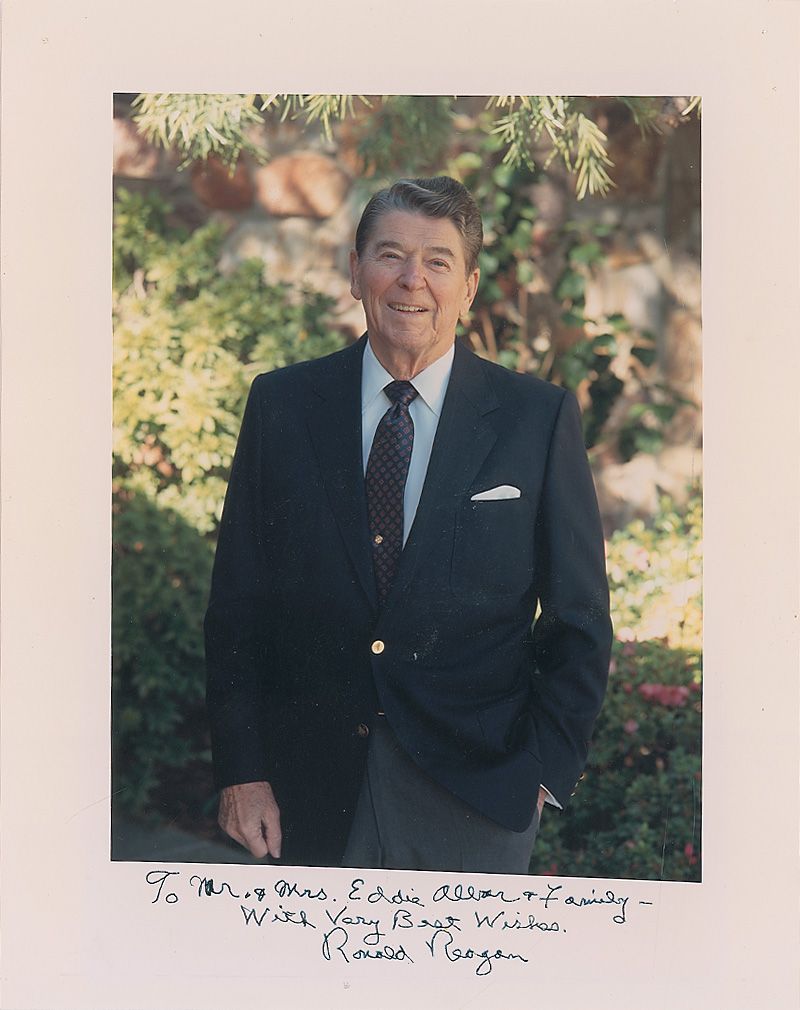 Color satin-finish 7.75 x 10 photo, signed and inscribed in black ink “To Mr. & Mrs. Eddie Albar & Family—With very best wishes, Ronald Reagan.” In very good condition, with tack holes to top corners and bottom edge, irregular ink adhesion to signature and inscription, light bends to corners from previous display, and image slightly off center.