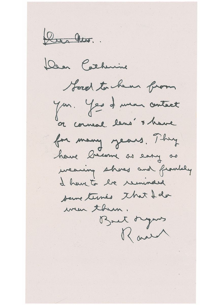 Draft ALS signed “Ronald,” one page, 4.75 x 8.5, no date. A letter to Catherine. In full: “Good to hear from you. Yes I wear contact or corneal lens’ & have for many years. They have become as easy as wearing shoes and frankly I have to be reminded sometimes that I do wear them.” In fine condition.