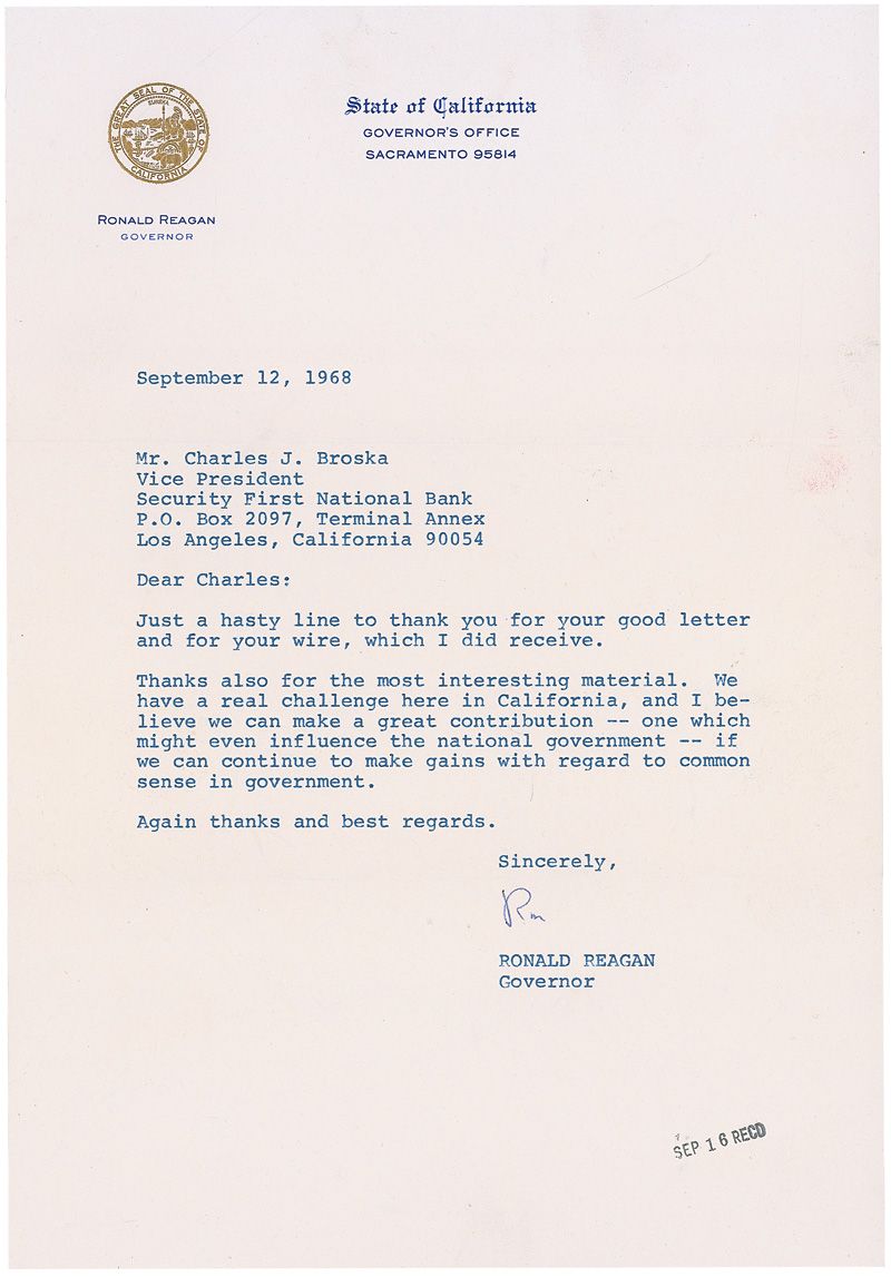 TLS signed “Ron,” one page, 7.25 x 10.25, State of California letterhead, September 12, 1968. Letter to Charles Broska. In part: “We have a real challenge here in California, and I believe we can make a great contribution—one which might even influence the national government—if we can continue to make gains with regard to common sense in government.” In fine condition, with small office stamp to bottom of page.