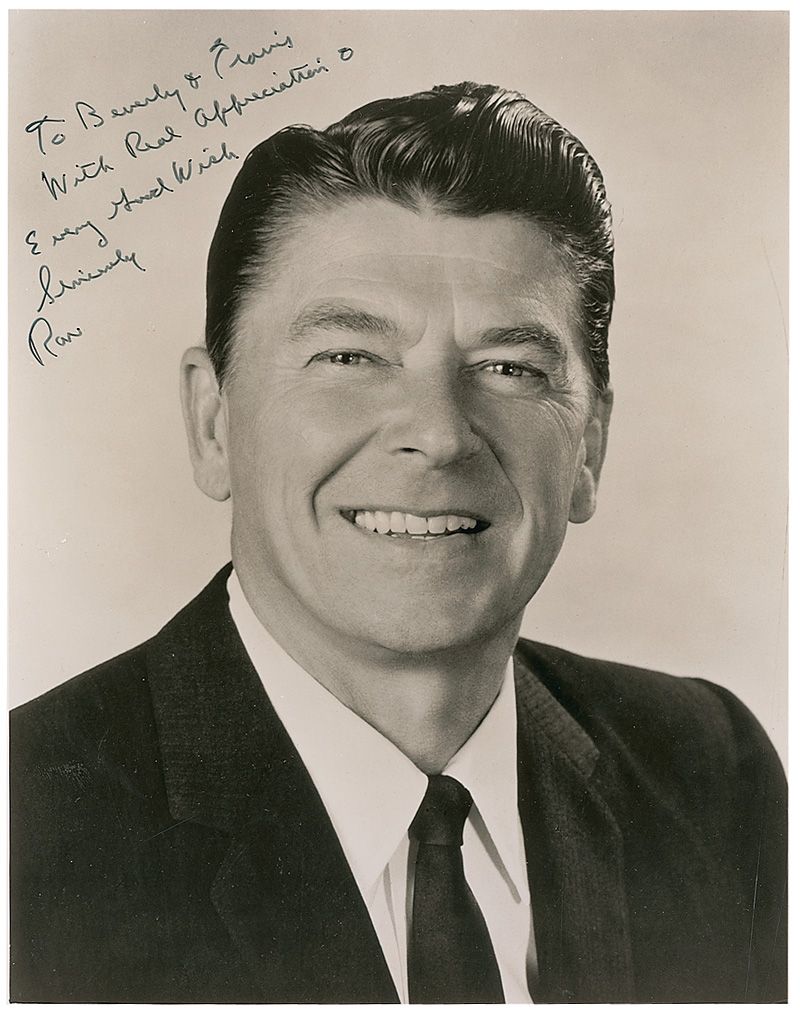 Vintage glossy 7.25 x 9.25 head-and-shoulders photo, signed and inscribed in black ink “To Beverly & Travis, with real appreciation & every good wish, Sincerely, Ron.” In very good condition, with trimmed edges, small hole near left edge, and some scattered creases.