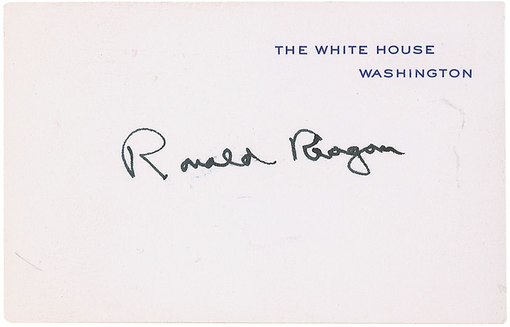 Rare White House card signed in black ink, “Ronald Reagan.” In fine condition, with a couple of trivial brushes to signature and a stray pencil mark to lower left.