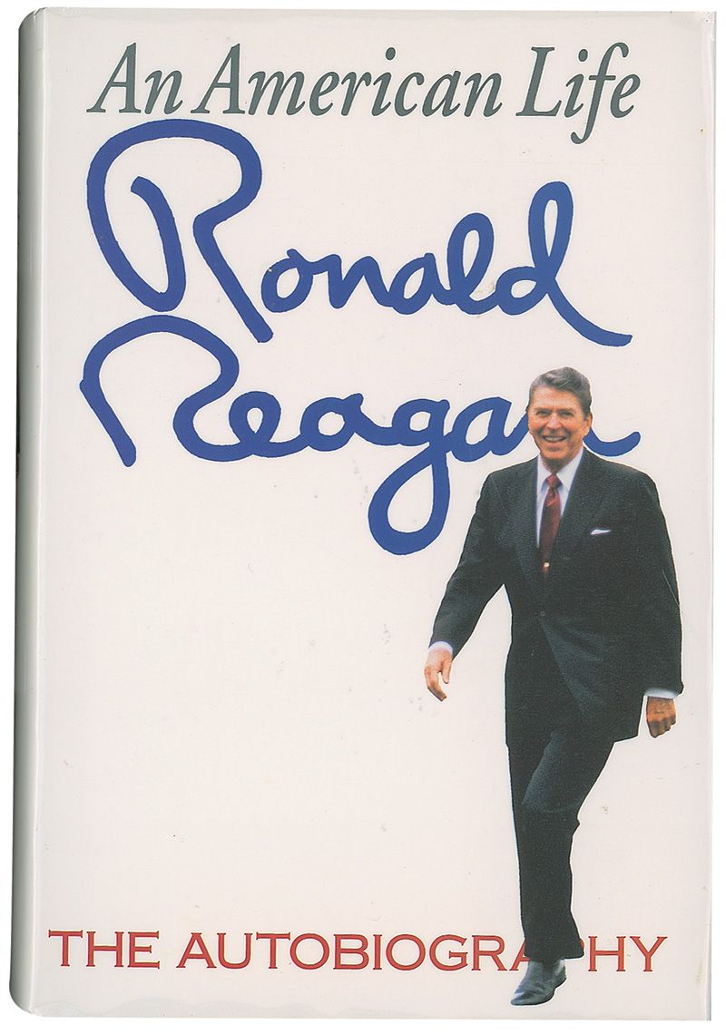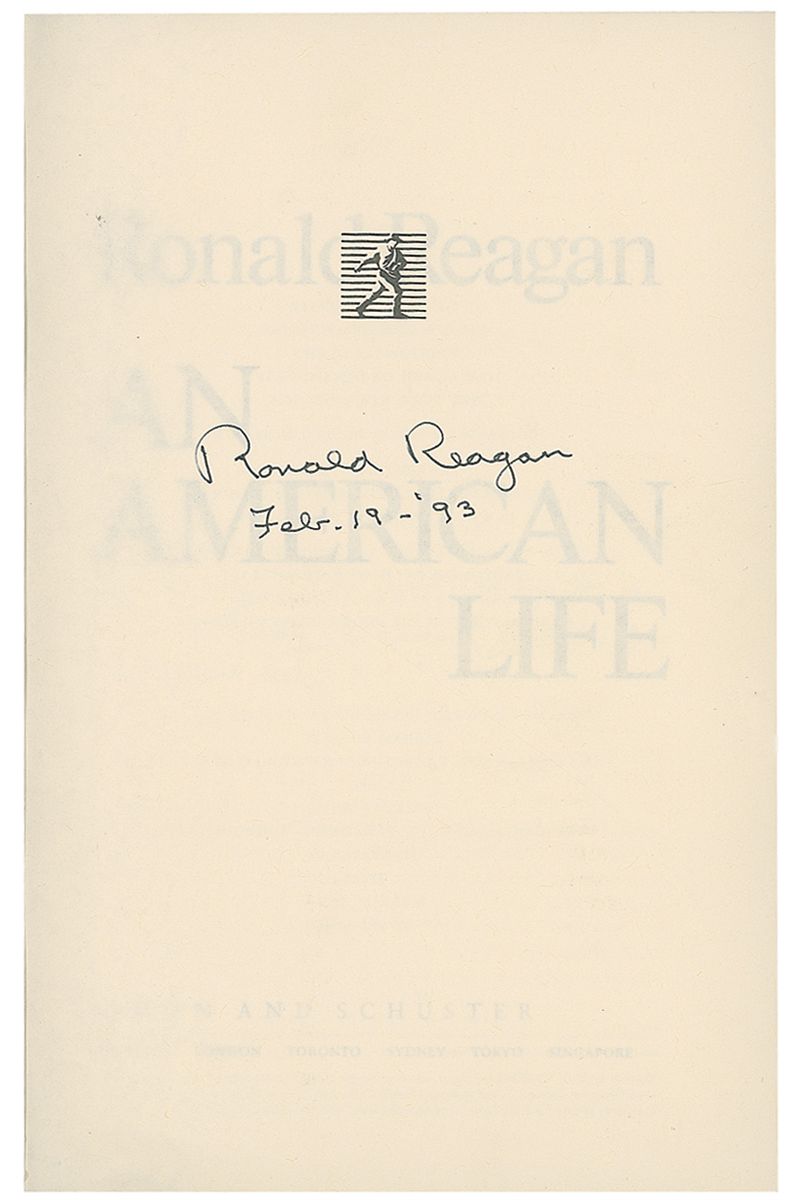Signed book: An American Life. First edition, later printing. NY: Simon & Schuster, 1990. Hardcover with dustjacket, 6.5 x 9.5, 748 pages. Signed on the second free end page in black ink, “Ronald Reagan, Feb. 19 – ‘93.” A photocopy of the mailing envelope is affixed to first free end page.
