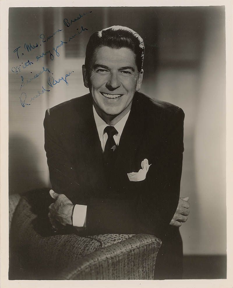 Vintage glossy 8 x 10 photo of Reagan leaning on a sofa, signed and inscribed in fountain pen “To Mrs. Emma Bracken, With every good wish, Sincerely, Ronald Reagan.” A few scattered light creases, mounting remnants on reverse, and some scattered irregular ink adhesion to portions of signature and inscription, otherwise fine condition.
