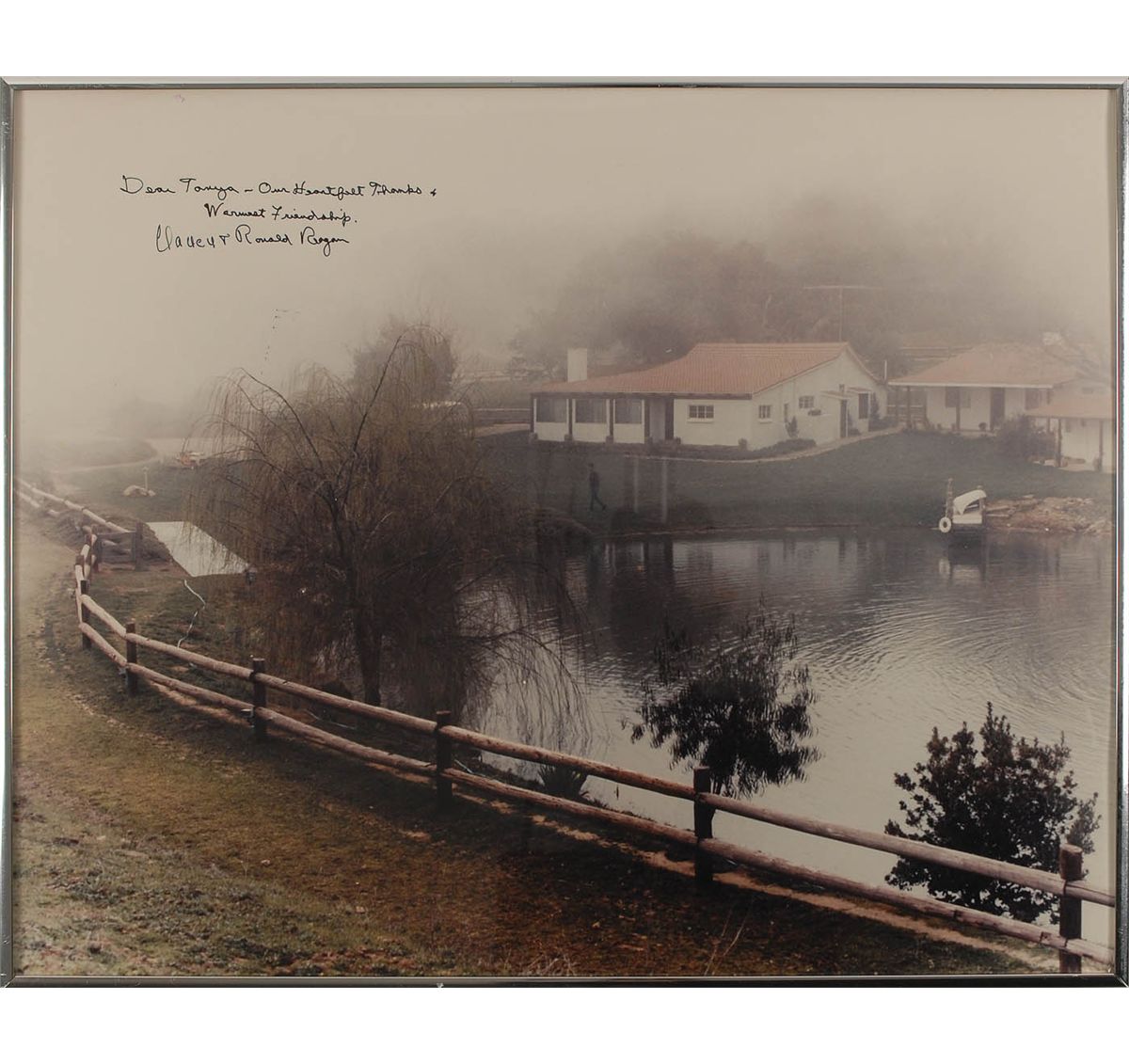 Scenic color satin-finish 19.75 x 15.75 photo of a quiet getaway, signed and inscribed in black felt tip “Dear Tanya—Our heartfelt thanks & warmest friendship, Ronald Reagan,” with Nancy Reagan signing her first name next to his. Framed to an overall size of 20.25 x 16.25. In fine condition, with a couple light scattered surface bends and creases, and a few stray ink marks.