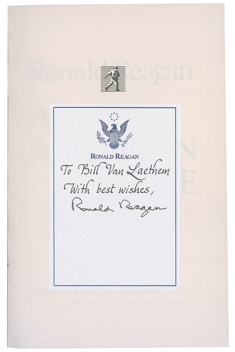 Signed book: An American Life. Later printing. NY: Simon & Schuster. Hardcover with dustjacket, 6.5 x 9.5, 1990 pages. Signed in black ink on a bookplate affixed to the second free end page, with an inscription in a calligrapher’s hand above signature. In fine condition, with clipped dustjacket and some scattered light wear and rubbing to dustjacket.