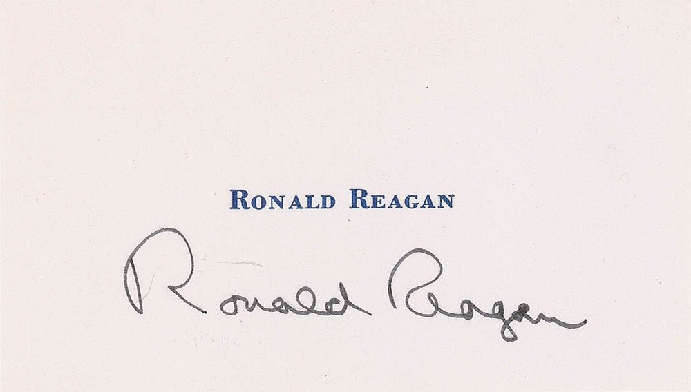Felt tip signature, “Ronald Reagan,” on an off-white 3.5 x 2 card bearing his name in print. In fine condition.