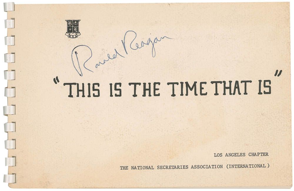 Spiral-bound program, 8.5 x 5.25, for the Los Angeles Chapter of The National Secretaries Association, signed on the front cover in blue ballpoint. Scattered toning and soiling to covers, and owner’s name written on the first page, otherwise fine condition.
