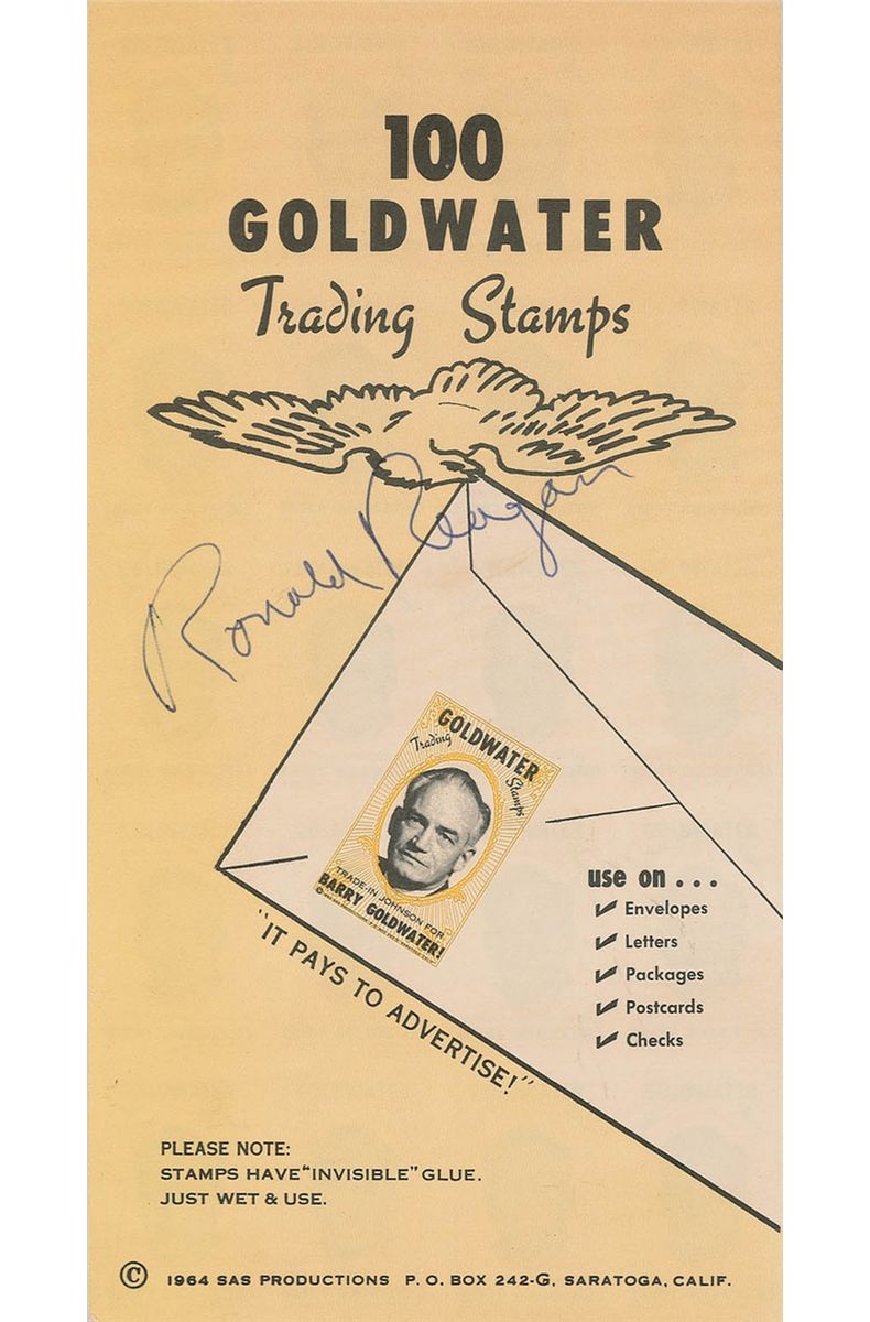Book of 100 Goldwater trading stamps, 4 x 7.5, 1964, signed on the front cover in blue ballpoint, “Ronald Reagan.” In fine condition.