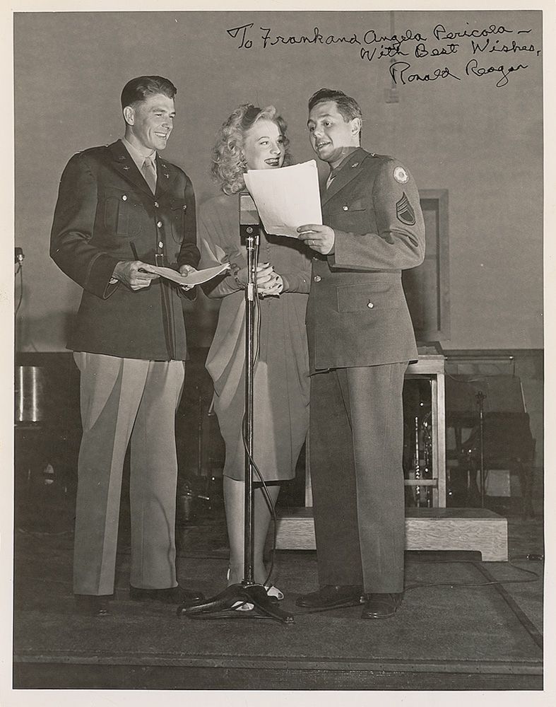 Vintage glossy 8 x 10 photo of Reagan on stage with Desi Arnaz and Anne Jeffries reading their scripts for their weekly radio show, The Birmingham Showtime Series, signed and inscribed later in black ink “To Frank and Angela Pericola—With best wishes, Ronald Reagan.” Reverse of photo is stamped Official Photograph, Birmingham General Hospital.” Light overall surface creases, otherwise fine condition.