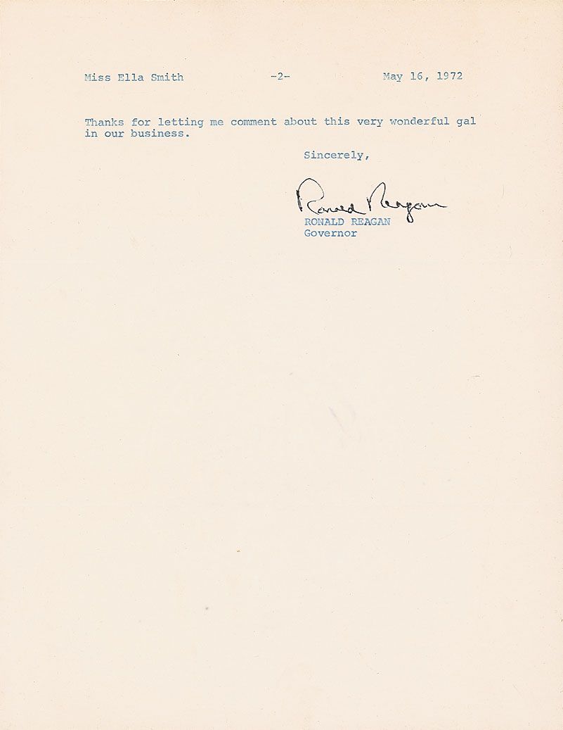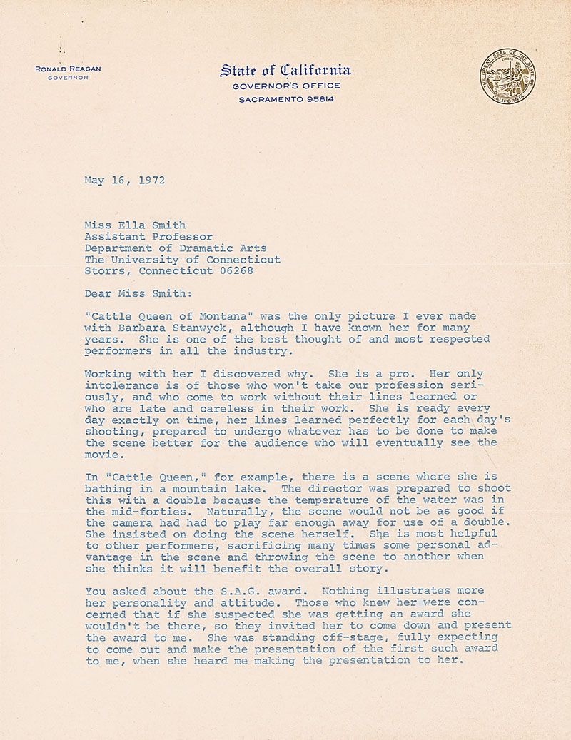TLS, two pages, 8.5 x 11, State of California Governor’s Office letterhead, May 16, 1972. Letter to a theater professor at the University of Connecticut. In part: “‘Cattle Queen of Montana’ was the only picture I ever made with Barbara Stanwyck…She is a p