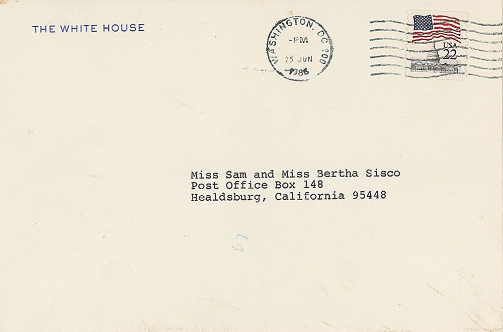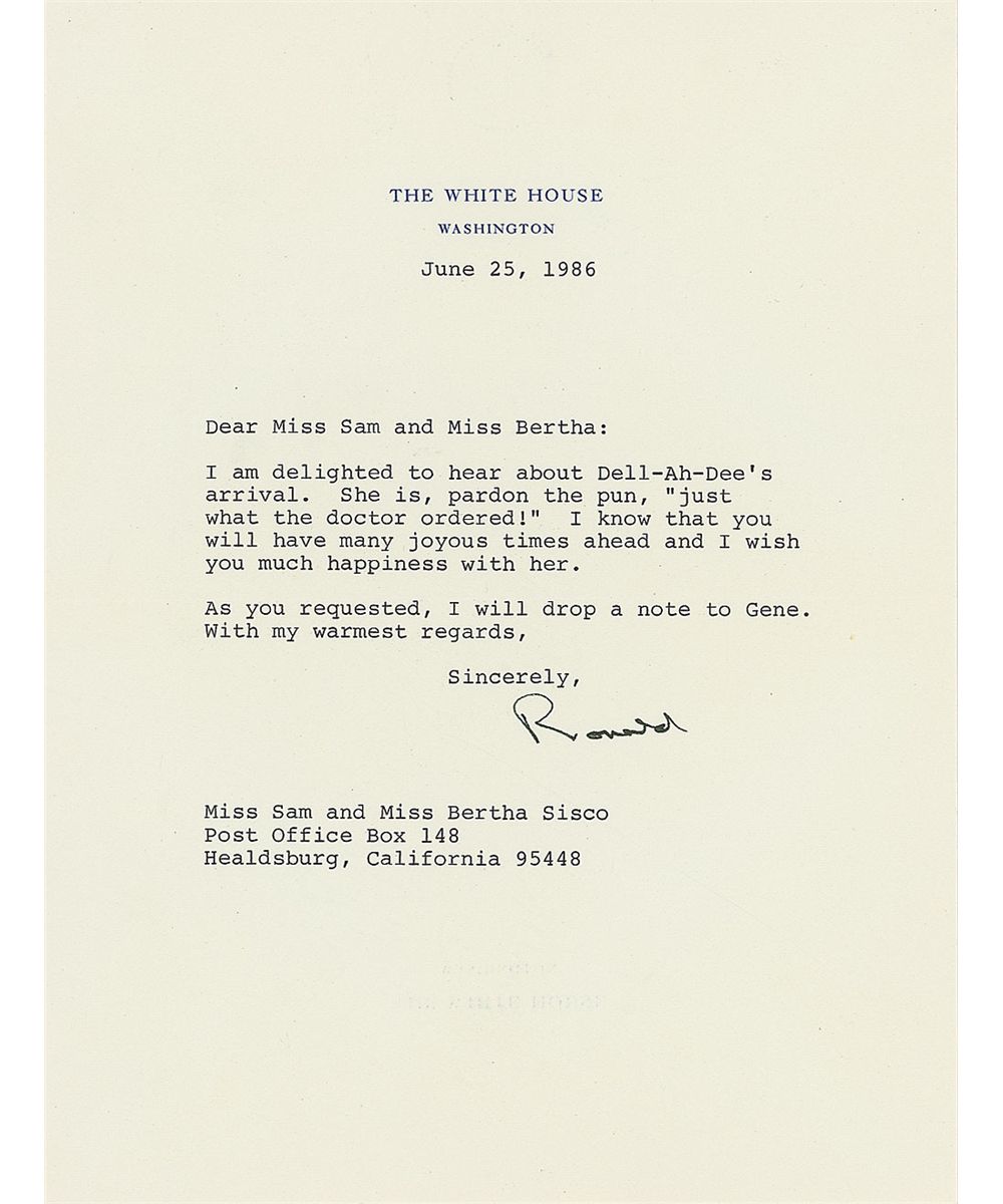TLS as president signed “Ronald,” one page, 6.75 x 9, The White House, Washington letterhead, June 25, 1986. Letter to the Sisco sisters, “Miss Sam” and “Miss Bertha,” regarding the arrival of pet that he had sent. In part: “I am delighted to hear about D