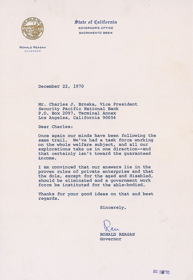 TLS signed “Ron,” one page, 7.25 x 10.5, State of California, Governor’s Office letterhead, December 22, 1970. Letter to a bank vice president. In part: “We’ve had a task force working on the whole welfare subject, and all our explorations take us in one