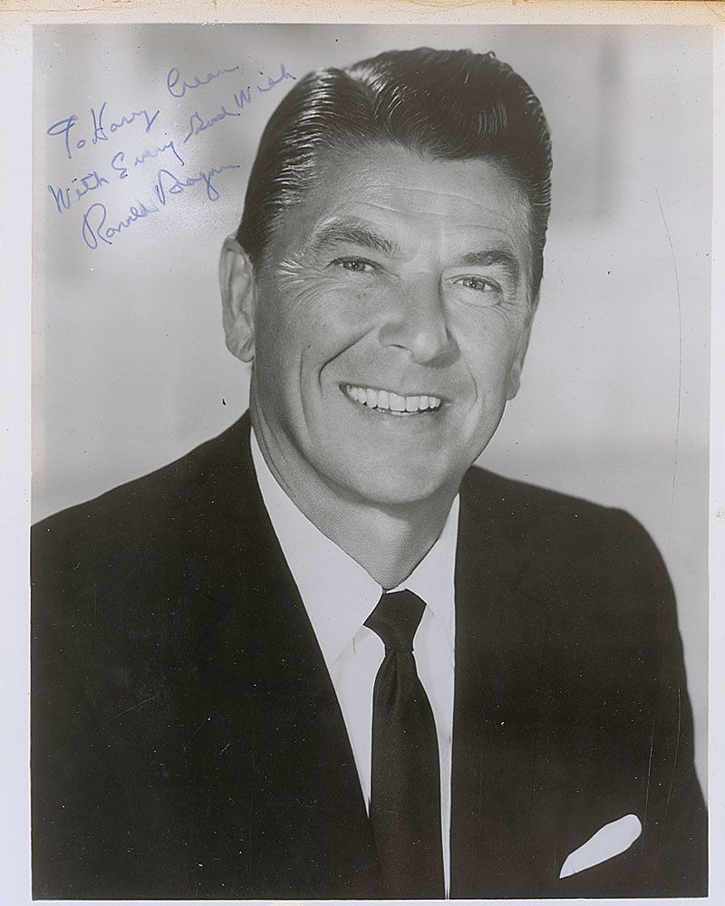 Glossy 7.75 x 9.75 photo of Reagan as governor of California, signed and inscribed in blue felt tip “To Harry Cream, with every good wish, Ronald Reagan.” Light creasing and toning to the upper border, lightly trimmed edges, and a couple slight brushes to