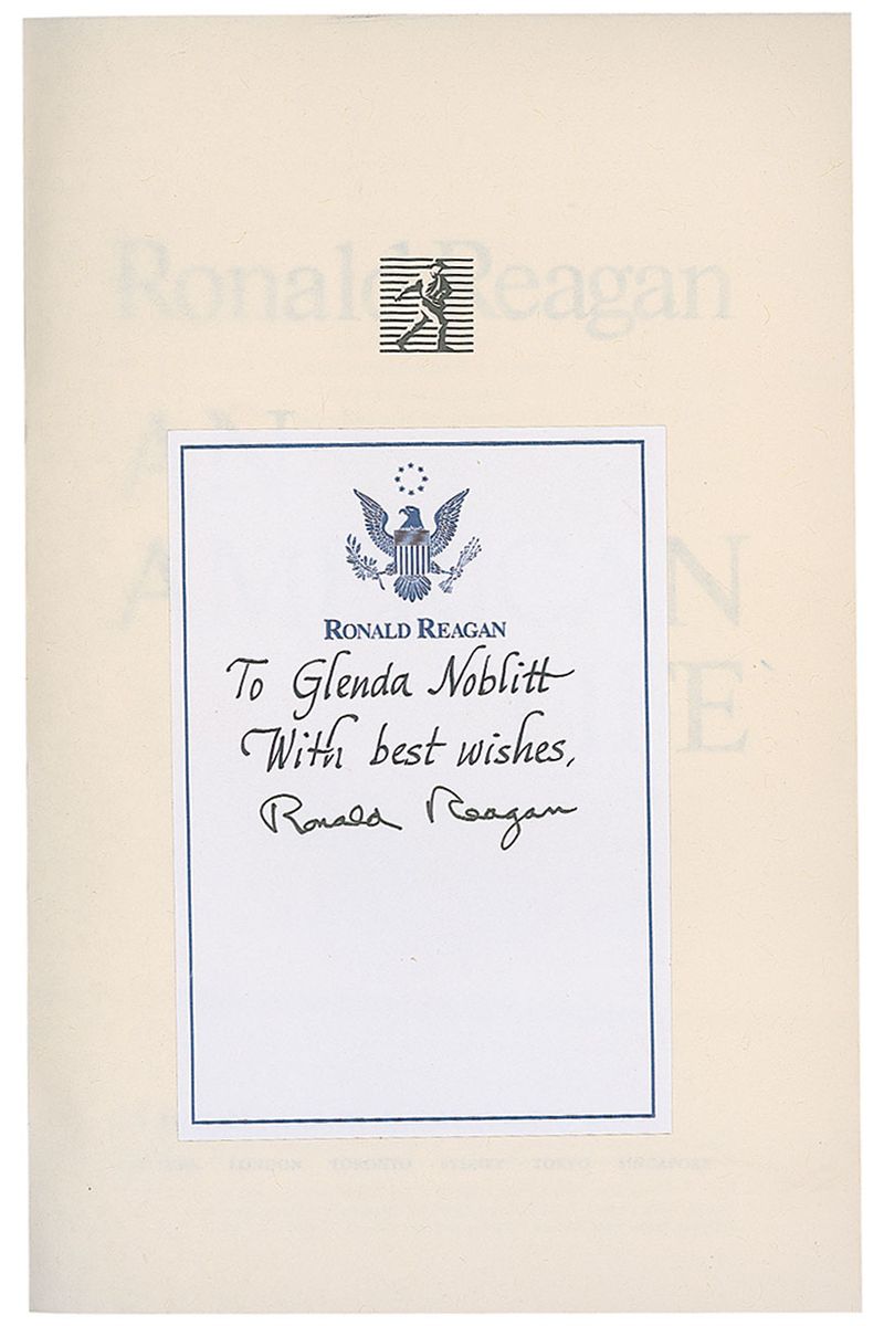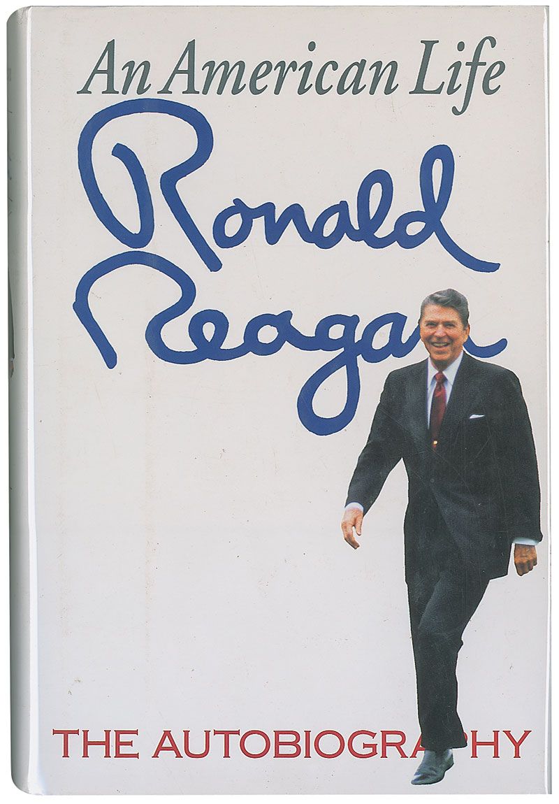 Signed book: An American Life. First edition, first printing. NY: Simon & Schuster, 1990. Hardcover with dust jacket, 6.5 x 9.5, 748 pages. Signed on a bookplate affixed to the first free end page, “Ronald Reagan,” and inscribed in a calligrapher’s hand,