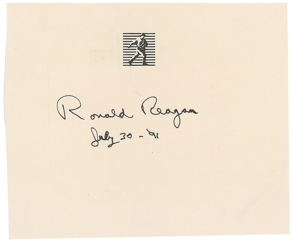 Felt tip signature, “Ronald Reagan, July 30-’91,” on an off-white 5.75 x 4.75 sheet. In fine condition, with a trimmed left edge and slight brush to signature.