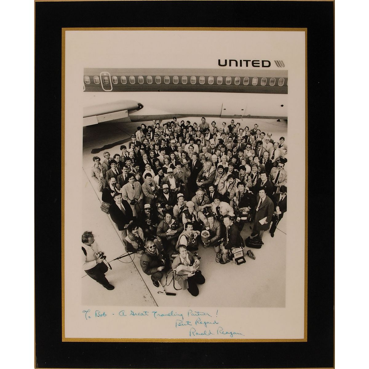 Glossy 10.5 x 13.5 photo of Reagan with staff and reporters in front of a United Airlines jet, signed and inscribed in blue ballpoint, “To Bob—a great traveling partner! Best Regards, Ronald Reagan.” Nicely mounted and laminated onto a black wooden plaque to an overall size of 13.5 x 16.5. In fine condition, with some trivial skipping to ink. There are several notables pictured in the crowd, including Chris Wallace, Martin Anderson, and James Brady.