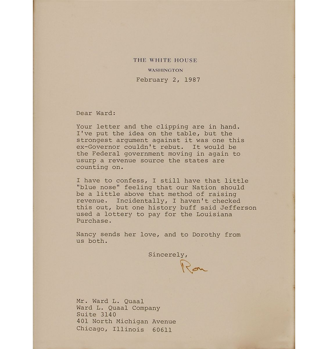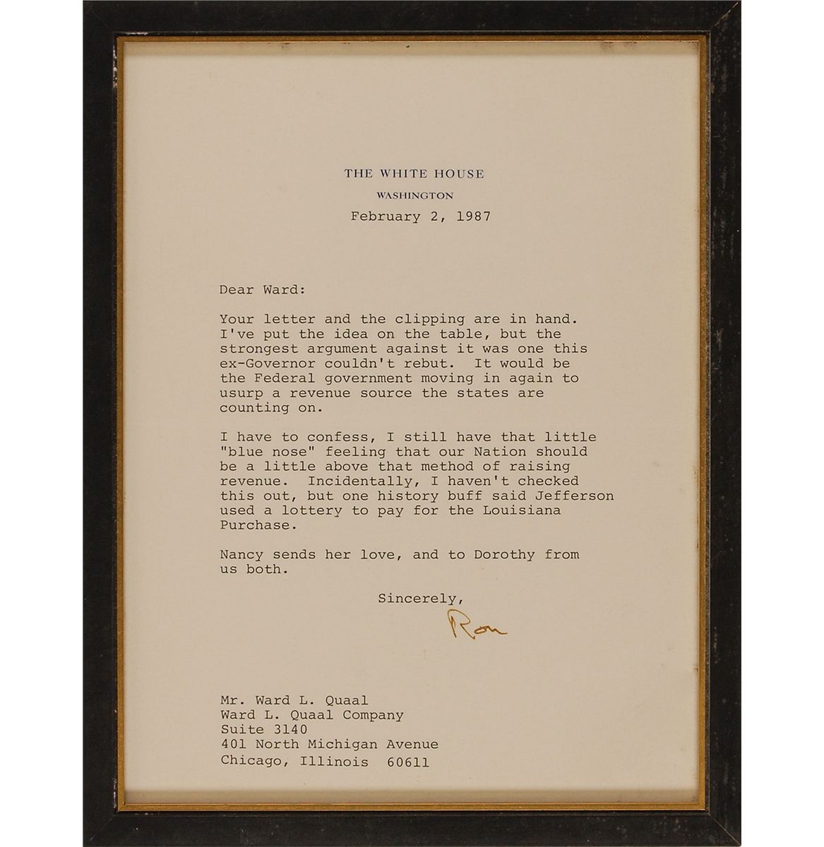 TLS as president signed “Ron,” one page, 6.5 x 8.5, White House letterhead, February 2, 1987. Letter to legendary Chicago broadcaster Ward Quaal. In full: “Your letter and clipping are in hand. I’ve put the idea on the table, but the strongest argument against it was one this ex-Governor couldn’t rebut. It would be the Federal government moving in again to usurp a revenue source the states are counting on. I have to confess, I still have that little ‘blue nose’ feeling that our Nation should be a little above that method of raising revenue. Incidentally, I haven’t checked this out, but one history buff said Jefferson used a lottery to pay for the Louisiana Purchase. Nancy sends her love, and to Dorothy from both of us.” Framed to an overall size of 7.5 x 9.5. In fine condition.