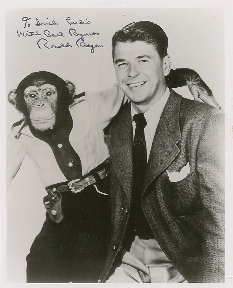 Glossy 8 x 10 photo of Reagan and Bonzo, signed and inscribed in black felt tip “To Irish Curtis, with best regards, Ronald Reagan.” In fine condition, with adhesive remnants to horizontal edges on reverse.